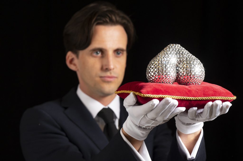 Được trưng bày tại London nhân Tháng Nhận thức về Ung thư Tinh hoàn, tác phẩm mô phỏng một cặp “báu vật” lấp lánh đặt trên đệm nhung, bên trong tủ kính kiểu bảo tàng, đi kèm cả phần chú thích như một hiện vật nghệ thuật chính thống. Tác phẩm do nghệ sĩ mixed media Quentin Devine thực hiện trong vòng hai tháng, với hơn 500 viên đá pha lê được gắn thủ công.
