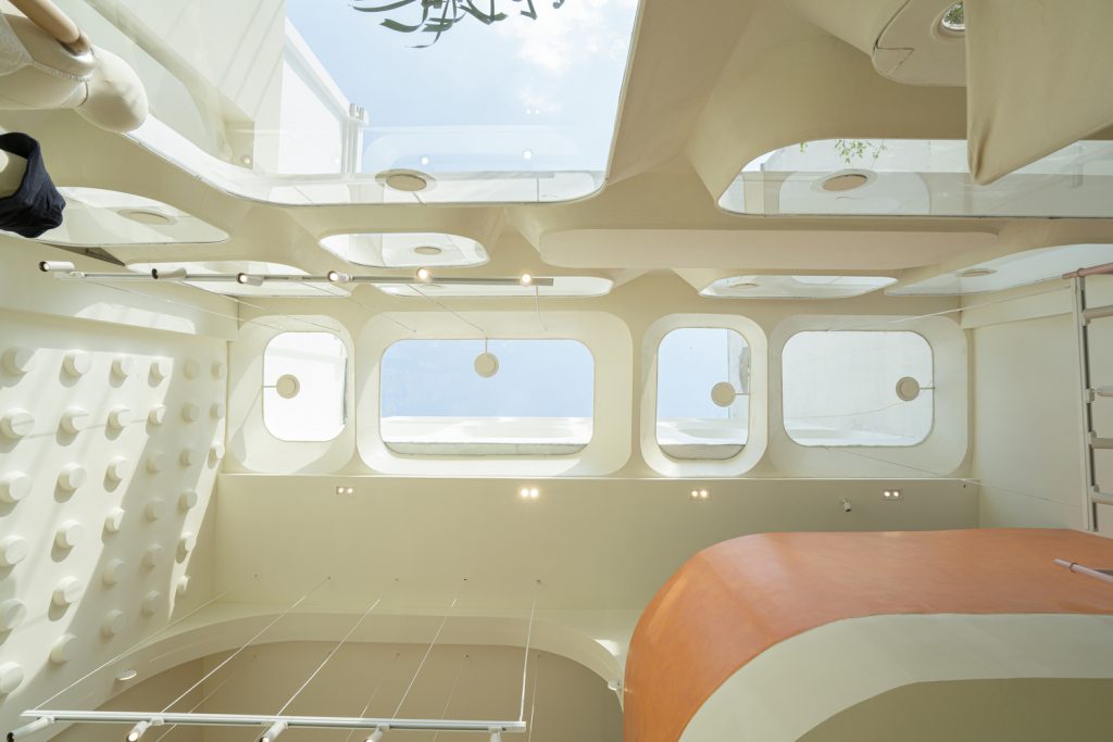 Ở tầng trên, sự vui tươi được nhấn mạnh với gạch lát nền khảm được lấy cảm hứng từ hồ bơi và cây xanh tươi tốt.