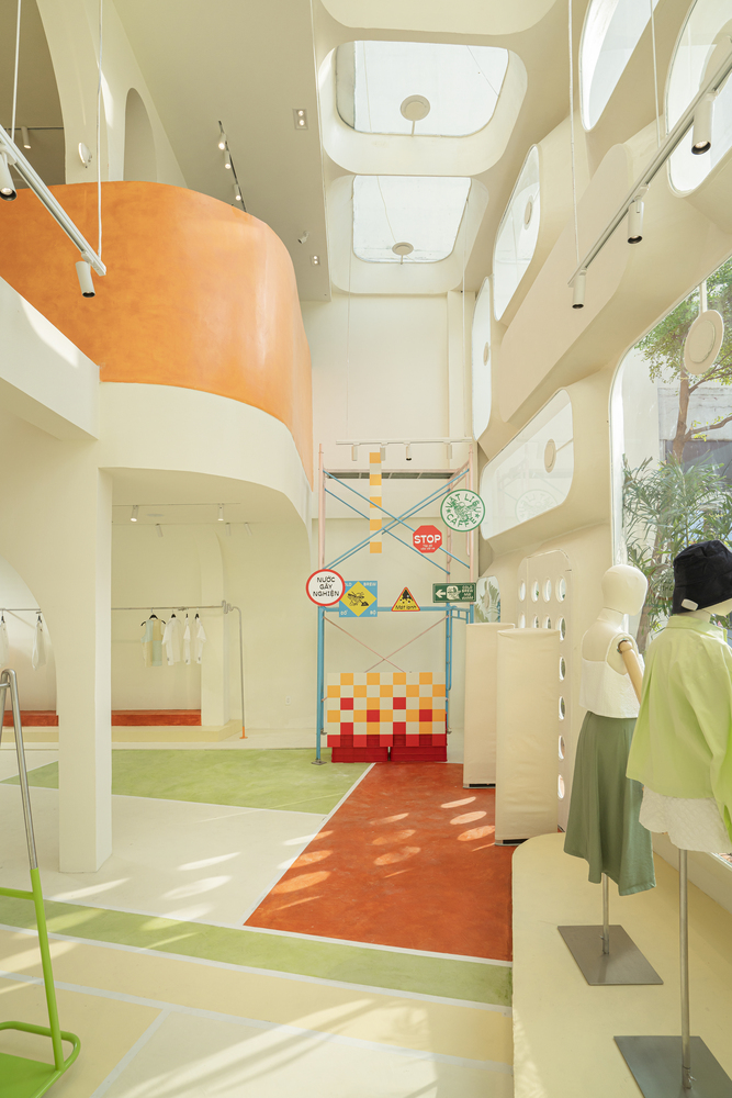 Đi vào xây dựng, KTS muốn thay đổi diện mạo thương hiệu Libe quen thuộc với nhiều màu sắc sặc sỡ; sàn lấy cảm hứng từ sân tennis được cắt bớt màu sắc. Hệ thống nội thất treo dọc hai bên tường được đặt trên nền gam màu trắng chủ đạo làm nổi bật sản phẩm. Bước vào khu vực quầy thu ngân, bạn sẽ có cảm tưởng đây là một nhà kho với những thùng nhựa, tủ đựng đồ. Điểm nối tầng trệt và thông tầng là dải cầu thang được nhấn mạnh với màu cam nổi bật thể hiện sự trẻ trung chủ đạo trong không gian.