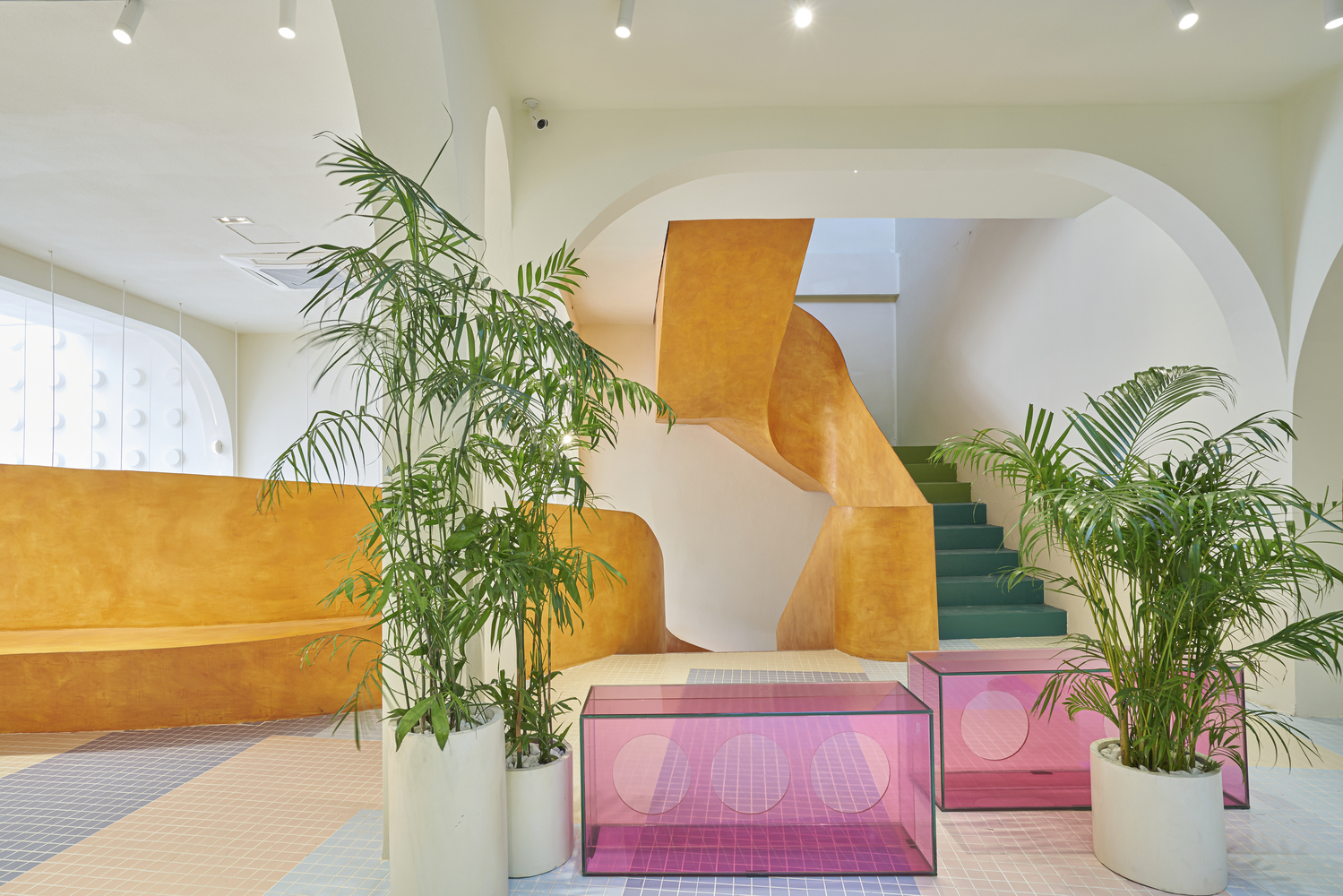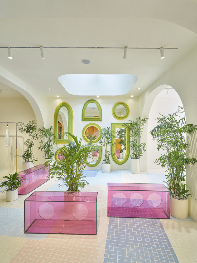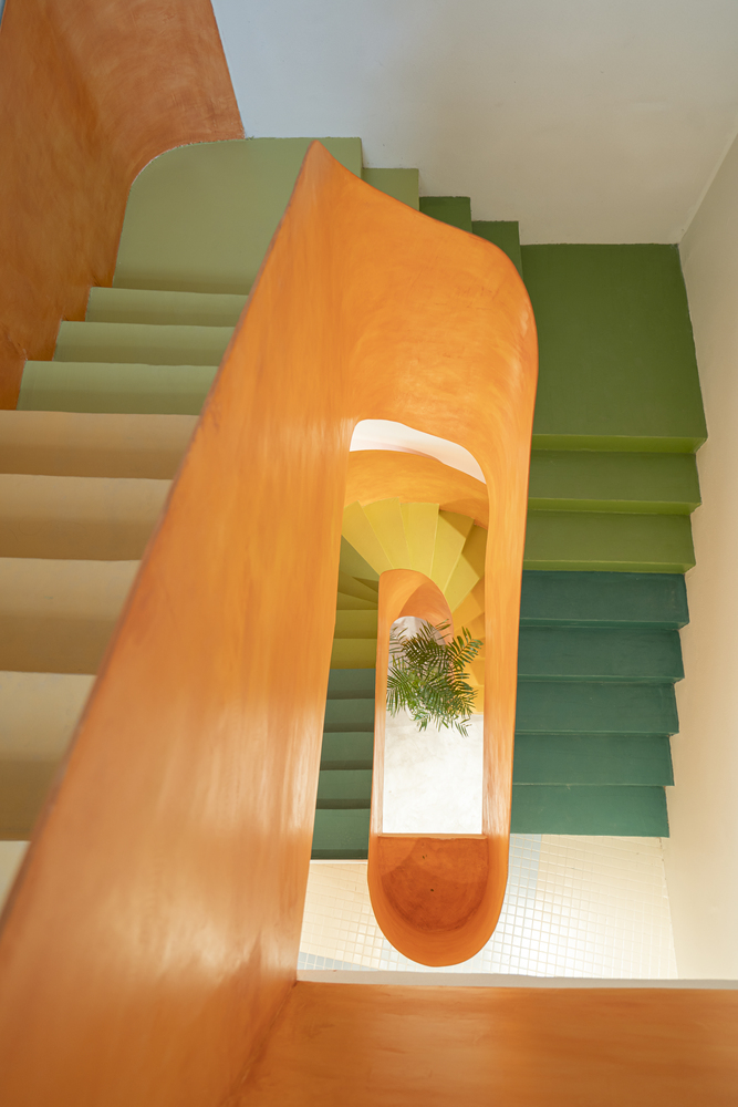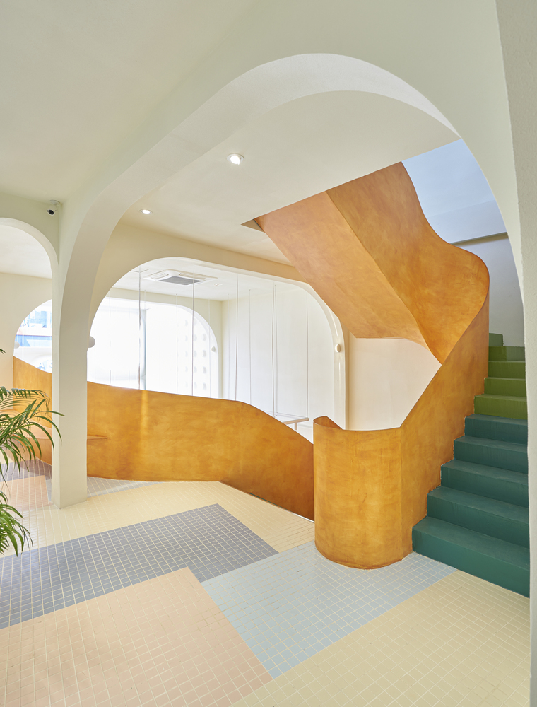 Ở tầng trên, sự vui tươi được nhấn mạnh với gạch lát nền khảm được lấy cảm hứng từ hồ bơi và cây xanh tươi tốt.