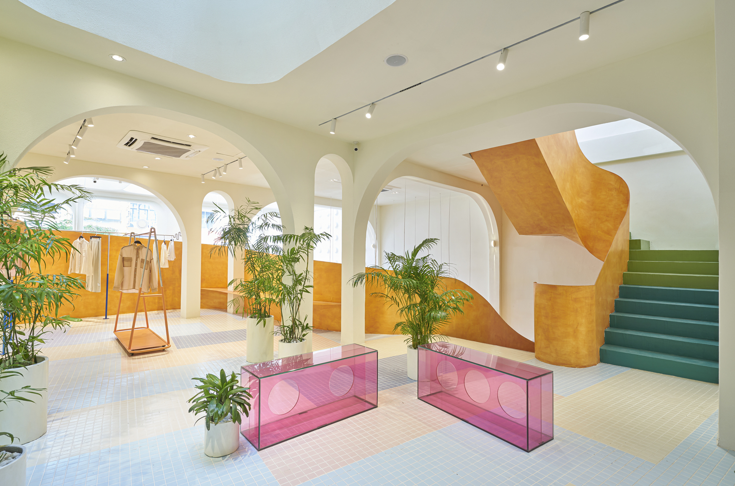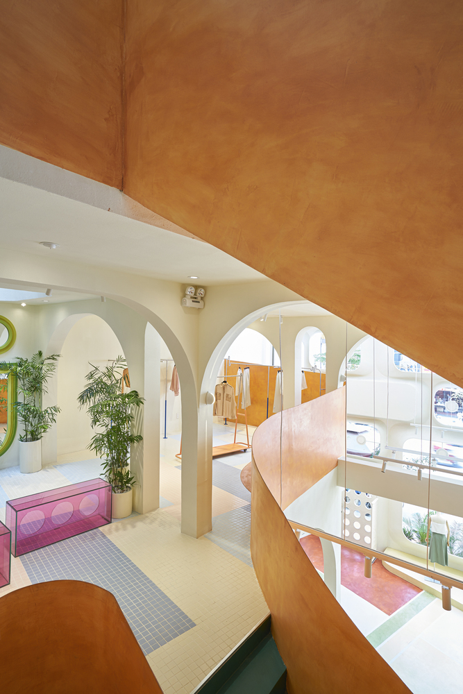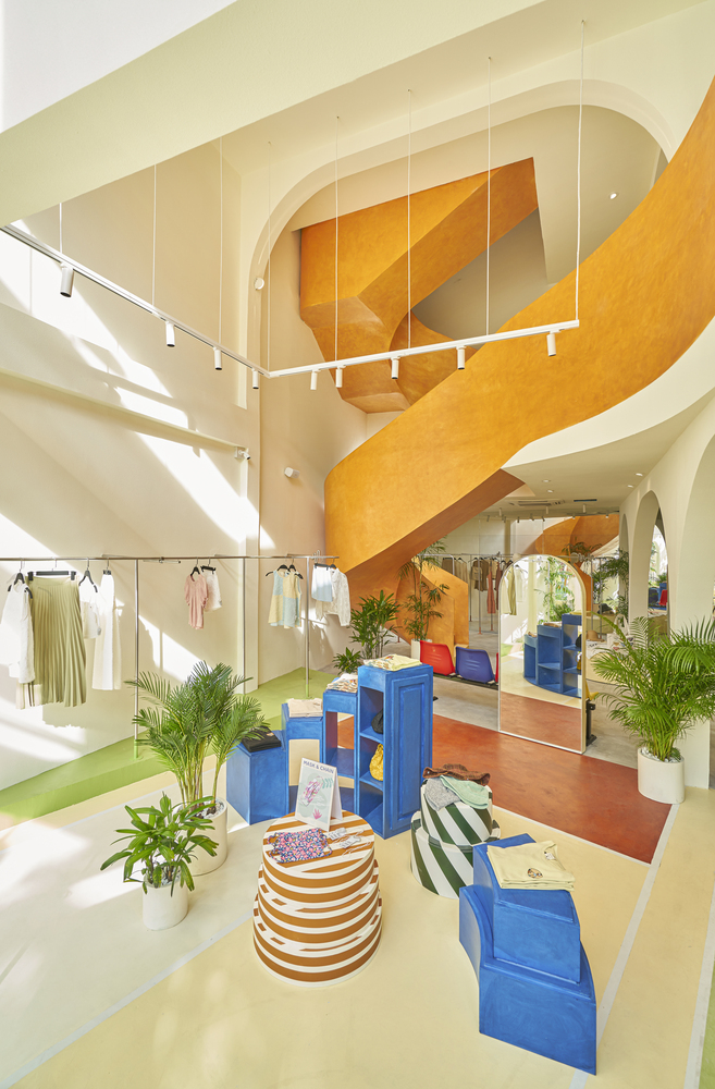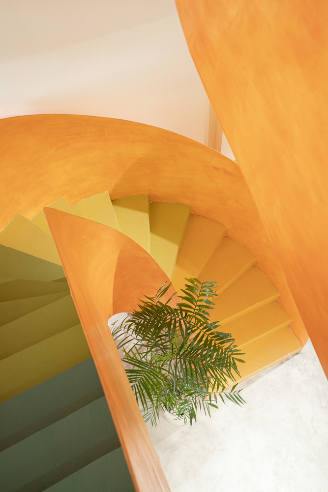 Ở tầng trên, sự vui tươi được nhấn mạnh với gạch lát nền khảm được lấy cảm hứng từ hồ bơi và cây xanh tươi tốt.