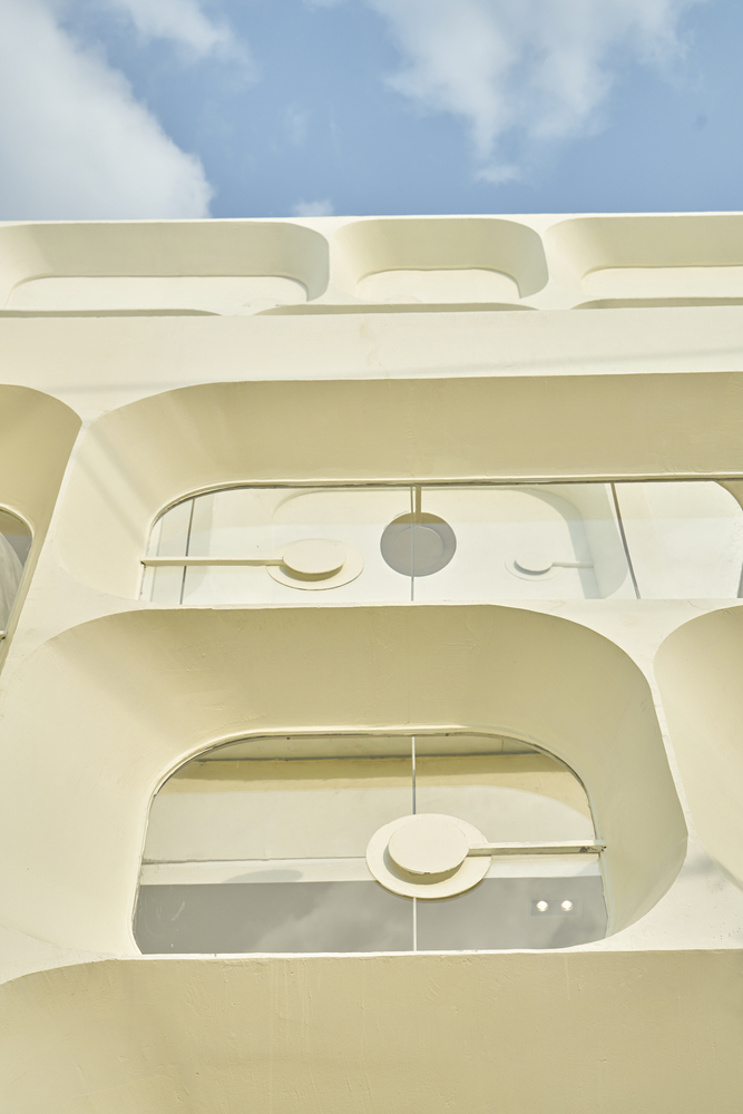Mặt tiền của công trình được lấy cảm hứng từ các hình khối cổ điển được làm bằng thép hình trụ màu đỏ được phủ một lớp sơn hiệu ứng.