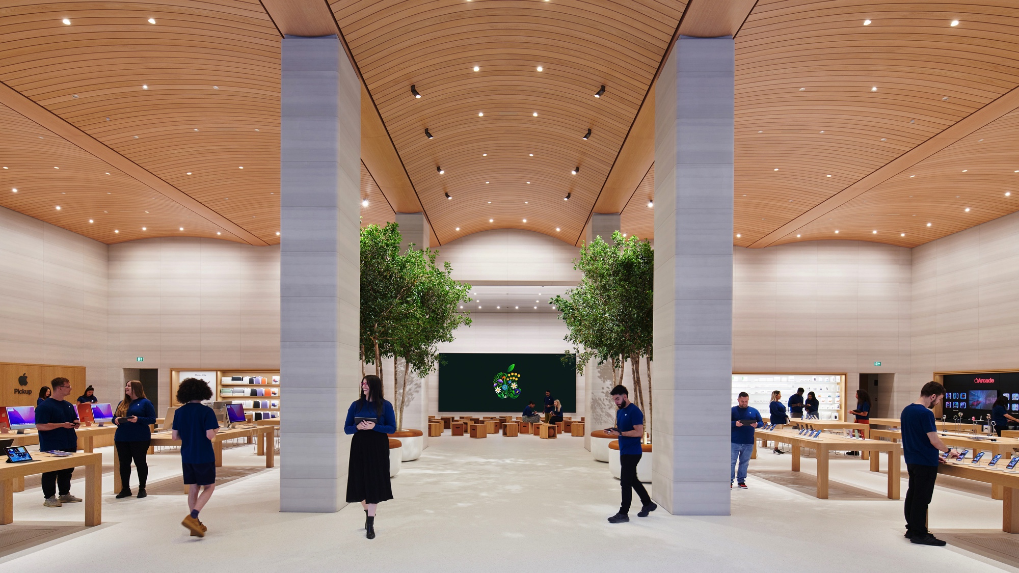 Cũng giống như với hầu hết các cửa hàng bán lẻ khác của Apple, gã khổng lồ công nghệ đã không quên đưa thiên nhiên vào thiết kế của Brompton Road với 12 cây lá đĩa Sicilia xếp dọc cửa sổ kính suốt từ trần đến sàn, với chỗ ngồi ở chân mỗi chậu cây như điểm gặp gỡ hoàn hảo.