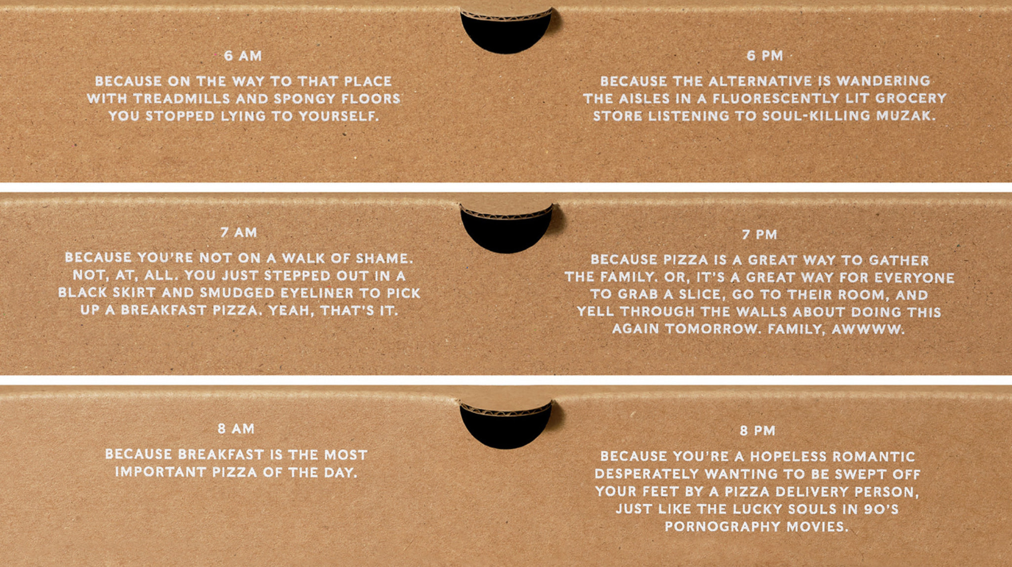 7 West là một cửa hàng pizza mở cửa 24/7 ở Toronto muốn tăng số lượng đơn đặt hàng bánh pizza ngoài giờ. Nhận được đề bài, Leo Burnett Canada đã tạo ra một chiến dịch nhắm đến khách hàng mục tiêu của cửa hàng bằng cách biến hộp bánh pizza của 7 West thành động lực thúc đẩy người mua bánh vào bất kỳ thời gian nào trong ngày.