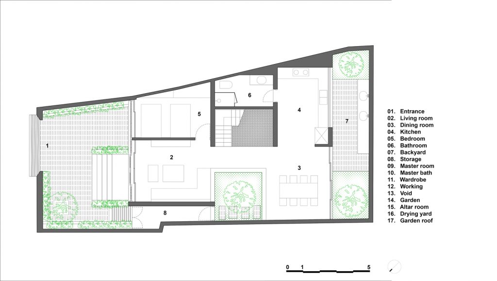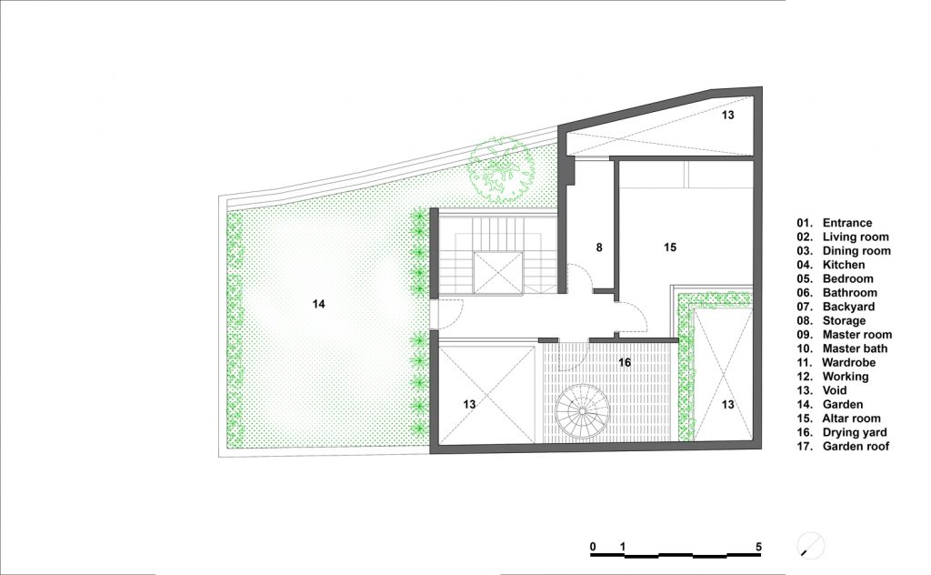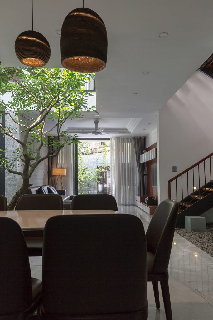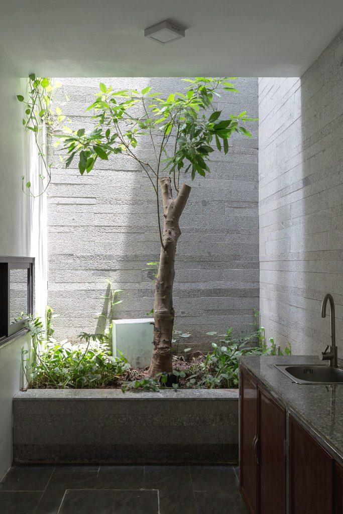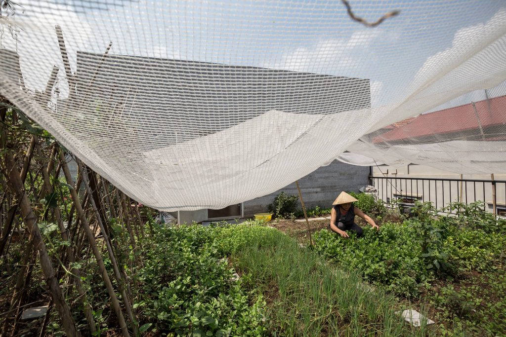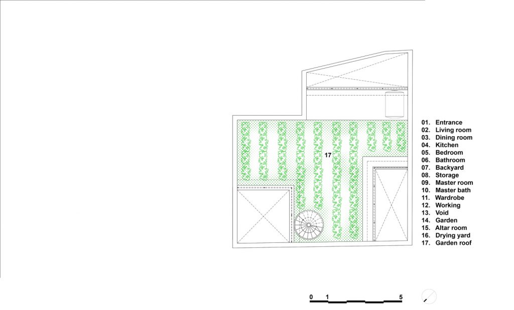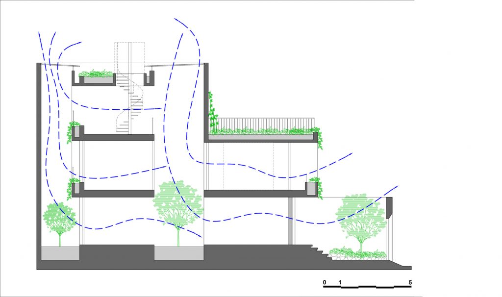 Mặt tiền ngôi nhà chủ yếu nghiêng về hướng đông nên thuận tiện về hướng đón gió vào mùa nóng và bất lợi về mùa lạnh nên không gian yêu cầu phải có sự linh hoạt về đóng mở. Các khu vườn xanh trên mái nhà không những bảo vệ cư dân khỏi ánh sáng trực tiếp của mặt trời, tiếng ồn đường phố và ô nhiễm mà còn là nơi sản xuất rau sạch cung cấp dư thừa cho ngôi nhà và hàng xóm xung quanh. Hơn nữa, thông gió tự nhiên qua mặt tiền cùng với ba giếng trời cho phép ngôi nhà này tiết kiệm năng lượng lớn trong điều kiên khí hậu khắc nghiệt của miền bắc Việt Nam.