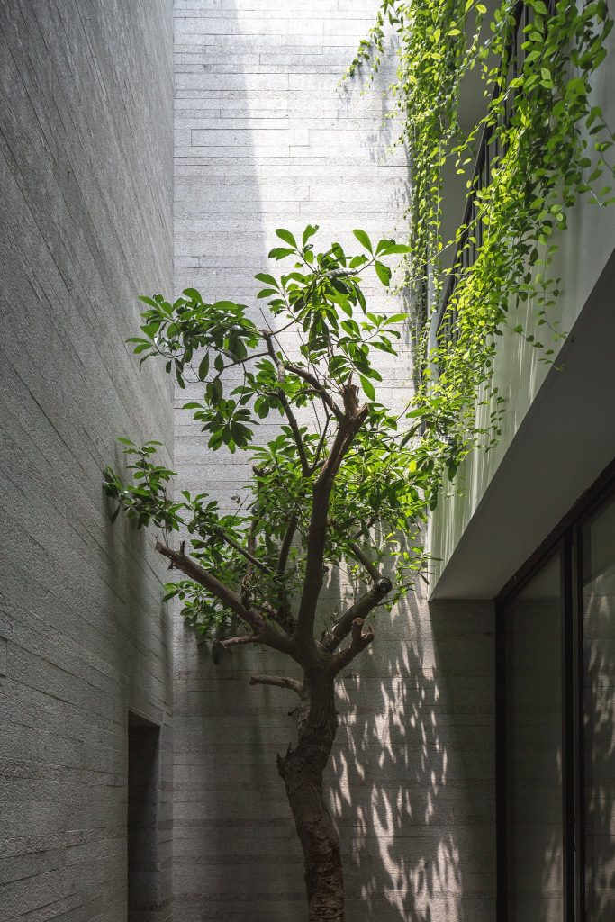Hình thể của khu đất là một hình nhiều hướng có nhiều góc méo. Thông thường đây sẽ là bất lợi trong thiết kế nhưng các kiến trúc sư đã tận dụng nó và tạo nên lợi thế để làm cho không gian trở nên vuông vắn và dễ sử dụng hơn. Các góc méo được tận dụng tối đa để tạo ra các khoảng trống lấy ánh sáng và kết hợp với các không gian xanh. Hầu như các không gian chức năng chính luôn có tới hai mặt tiếp xúc với nguồn ánh sáng tự nhiên và được tiếp giáp với không gian xanh. Kết hợp trong không gian xanh luôn kèm theo chất liệu địa phương và tự nhiên làm cho dự án trở nên thêm phần đặc biệt: bức tường đá Granit ghép tạo sự liên hệ với các lớp đá xếp tầng trong tự nhiên.