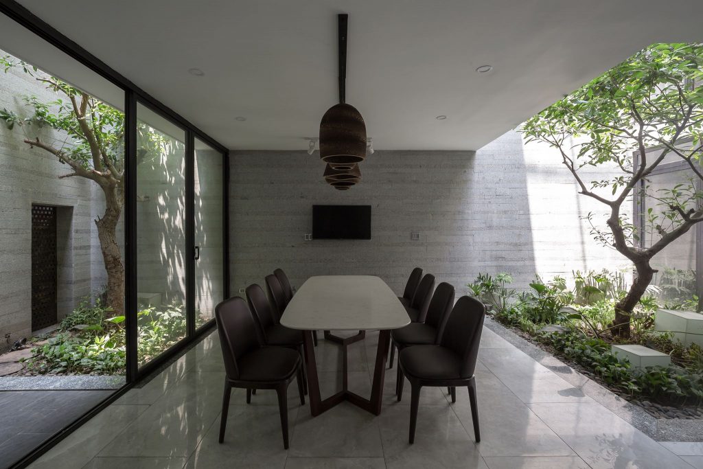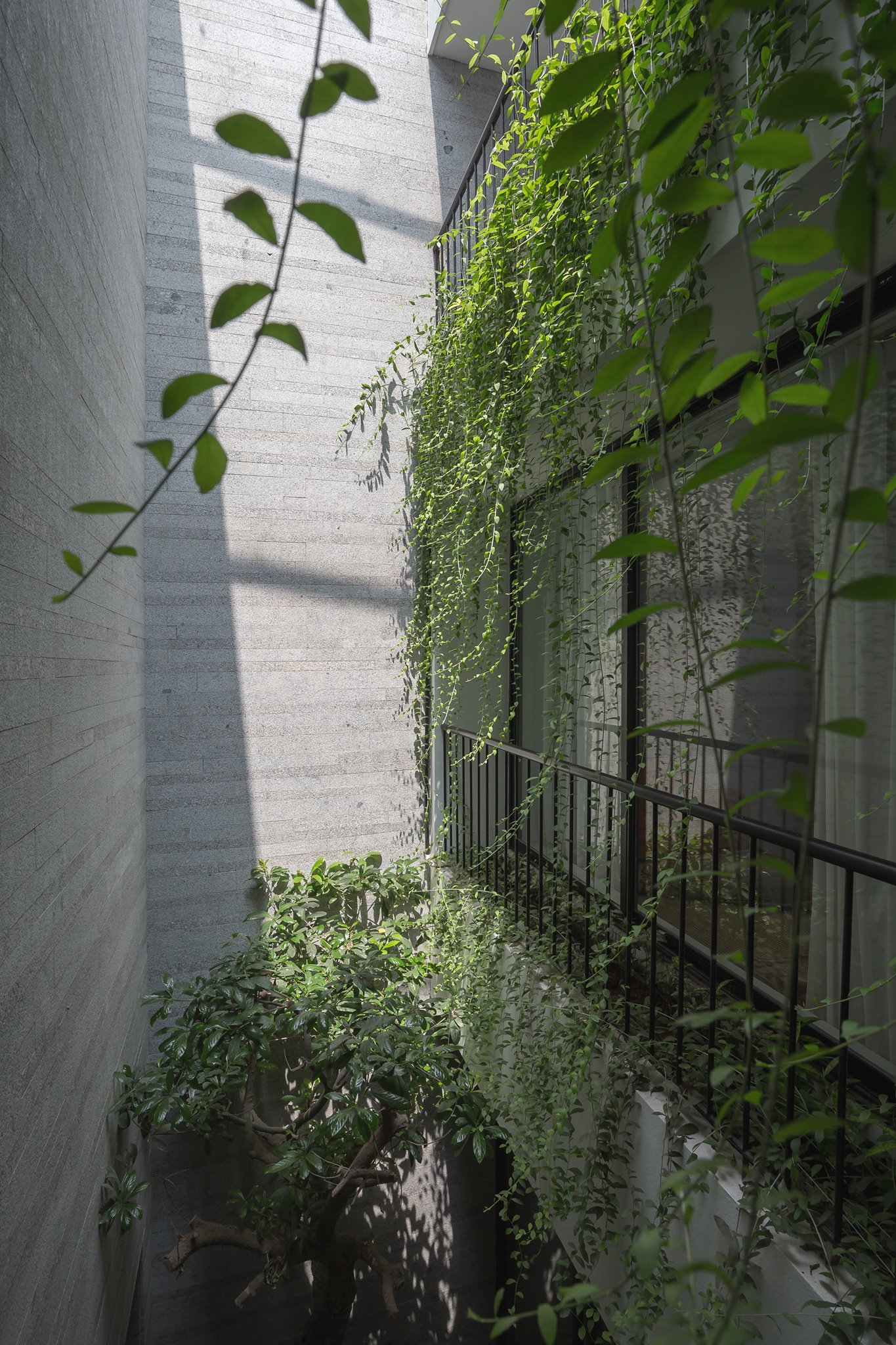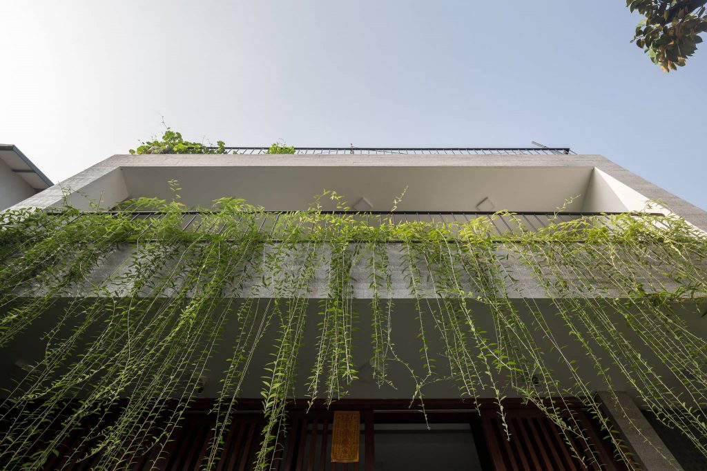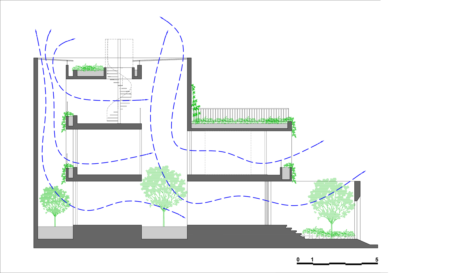 Mặt tiền ngôi nhà chủ yếu nghiêng về hướng đông nên thuận tiện về hướng đón gió vào mùa nóng và bất lợi về mùa lạnh nên không gian yêu cầu phải có sự linh hoạt về đóng mở. Các khu vườn xanh trên mái nhà không những bảo vệ cư dân khỏi ánh sáng trực tiếp của mặt trời, tiếng ồn đường phố và ô nhiễm mà còn là nơi sản xuất rau sạch cung cấp dư thừa cho ngôi nhà và hàng xóm xung quanh. Hơn nữa, thông gió tự nhiên qua mặt tiền cùng với ba giếng trời cho phép ngôi nhà này tiết kiệm năng lượng lớn trong điều kiên khí hậu khắc nghiệt của miền bắc Việt Nam.