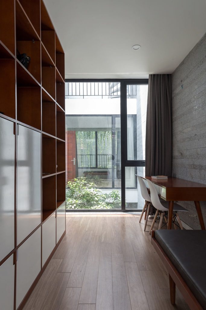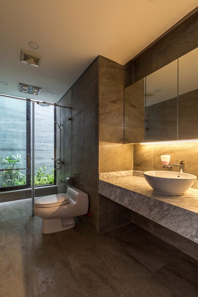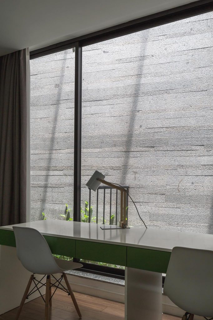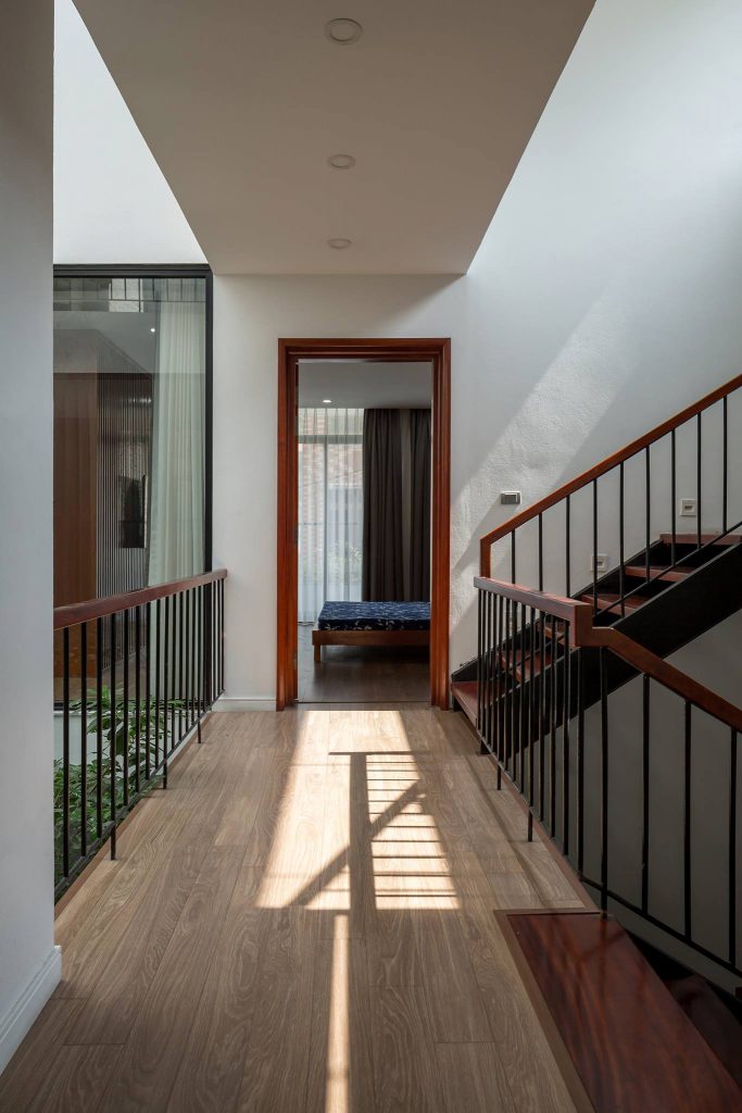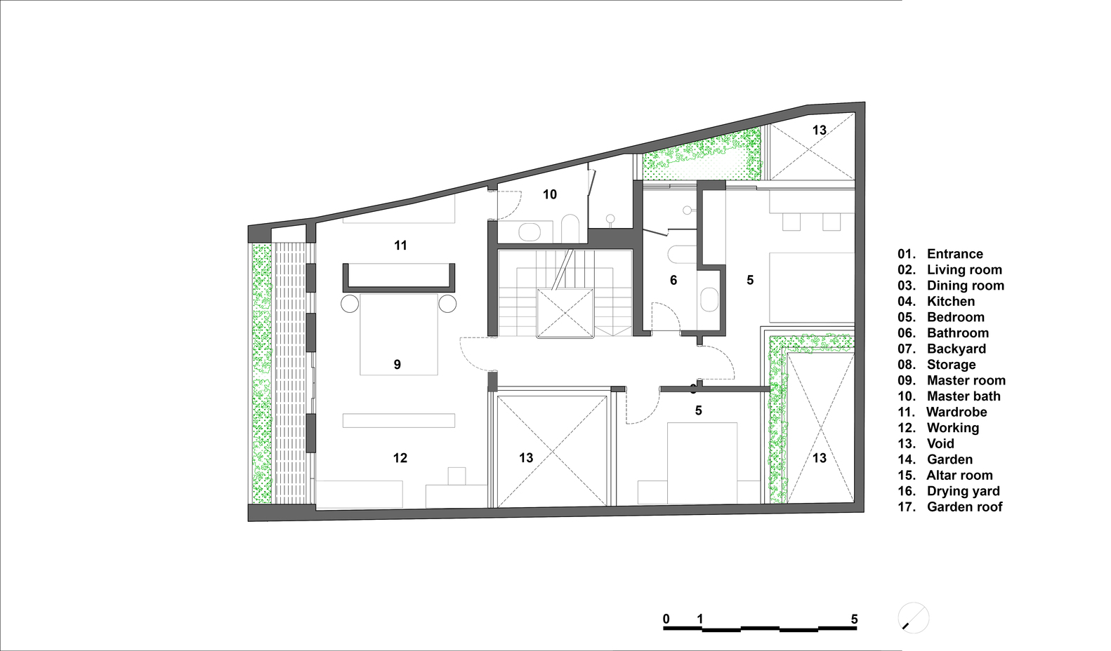Mặt tiền ngôi nhà chủ yếu nghiêng về hướng đông nên thuận tiện về hướng đón gió vào mùa nóng và bất lợi về mùa lạnh nên không gian yêu cầu phải có sự linh hoạt về đóng mở. Các khu vườn xanh trên mái nhà không những bảo vệ cư dân khỏi ánh sáng trực tiếp của mặt trời, tiếng ồn đường phố và ô nhiễm mà còn là nơi sản xuất rau sạch cung cấp dư thừa cho ngôi nhà và hàng xóm xung quanh. Hơn nữa, thông gió tự nhiên qua mặt tiền cùng với ba giếng trời cho phép ngôi nhà này tiết kiệm năng lượng lớn trong điều kiên khí hậu khắc nghiệt của miền bắc Việt Nam.