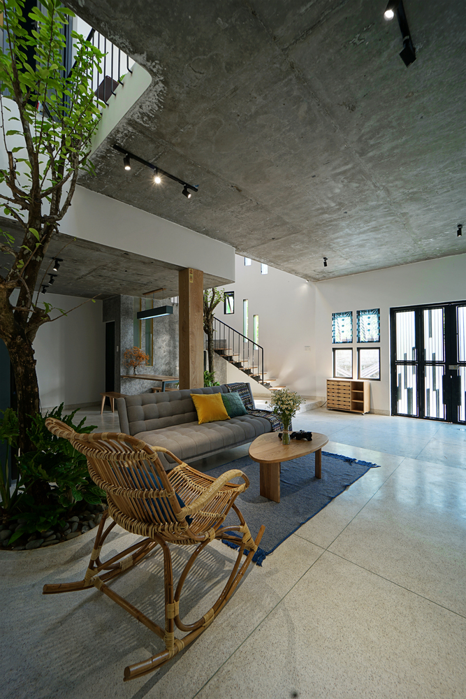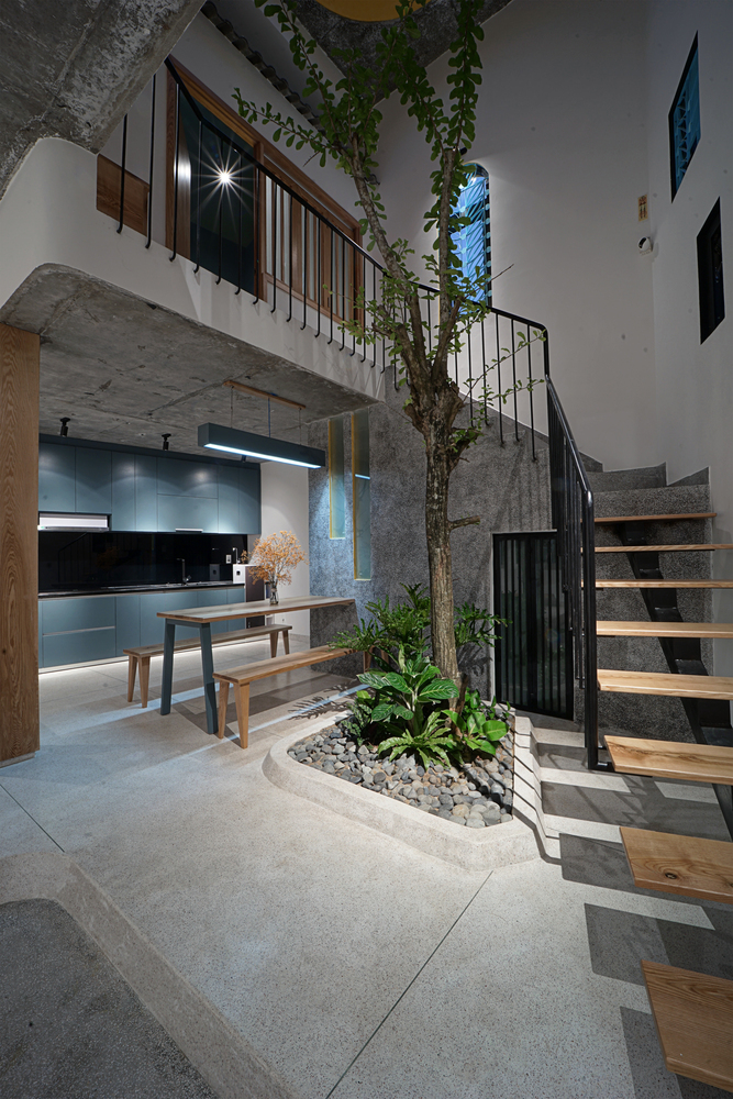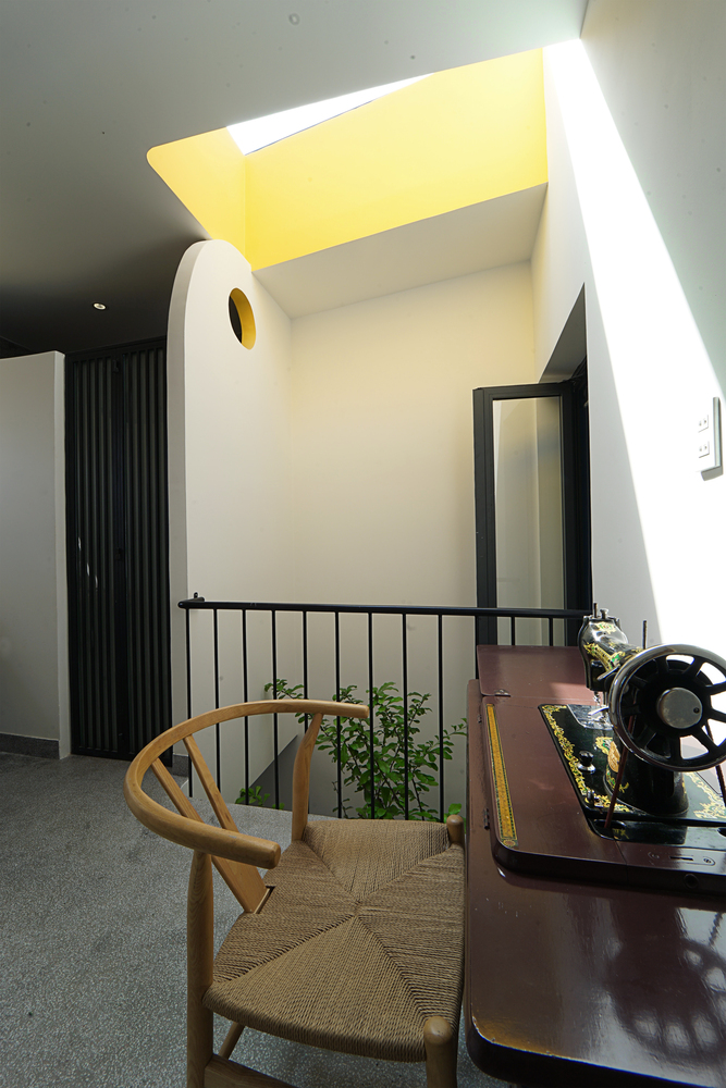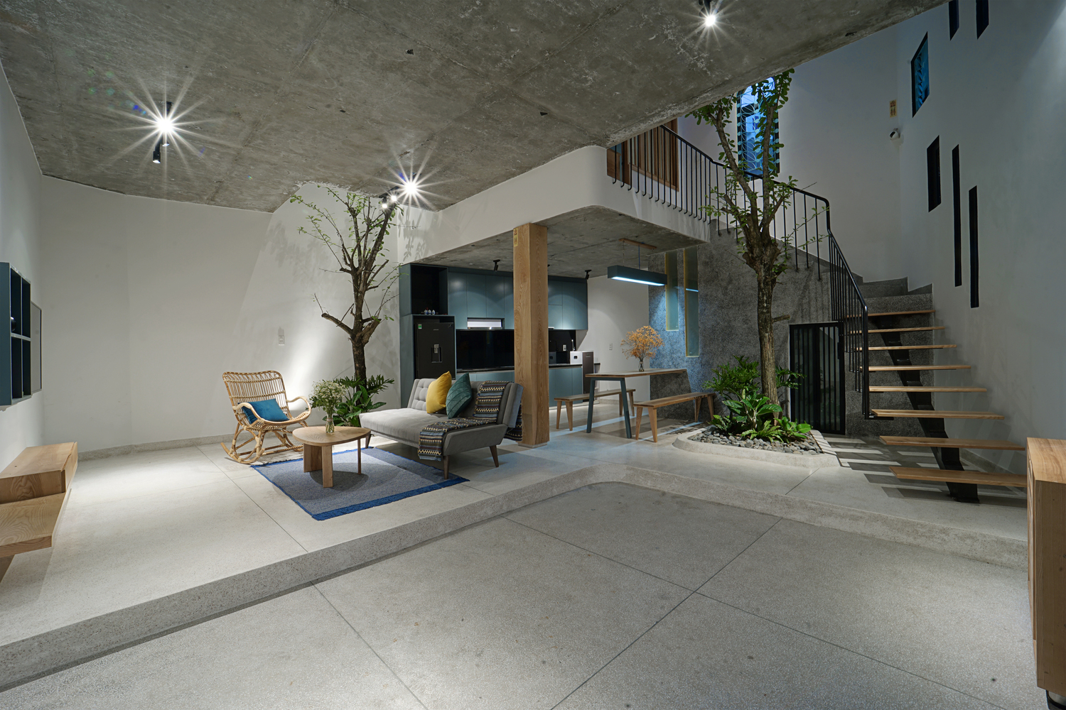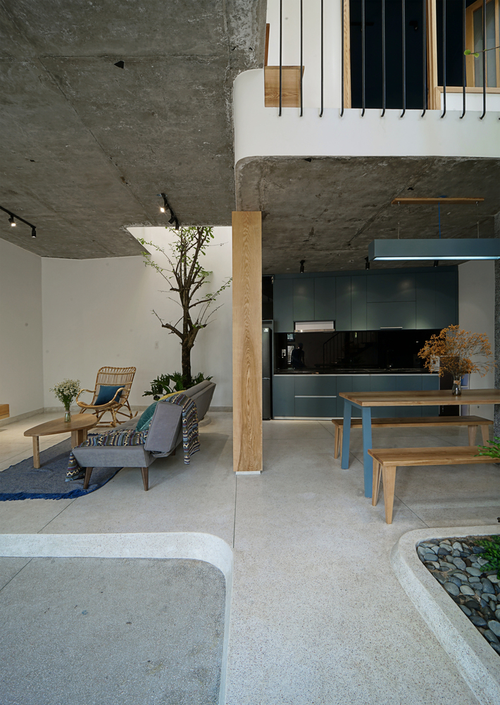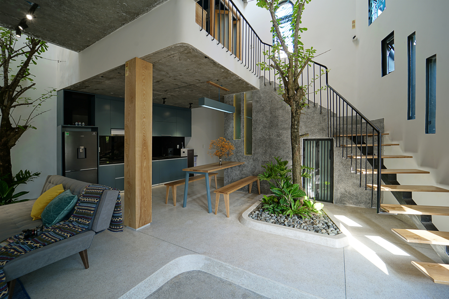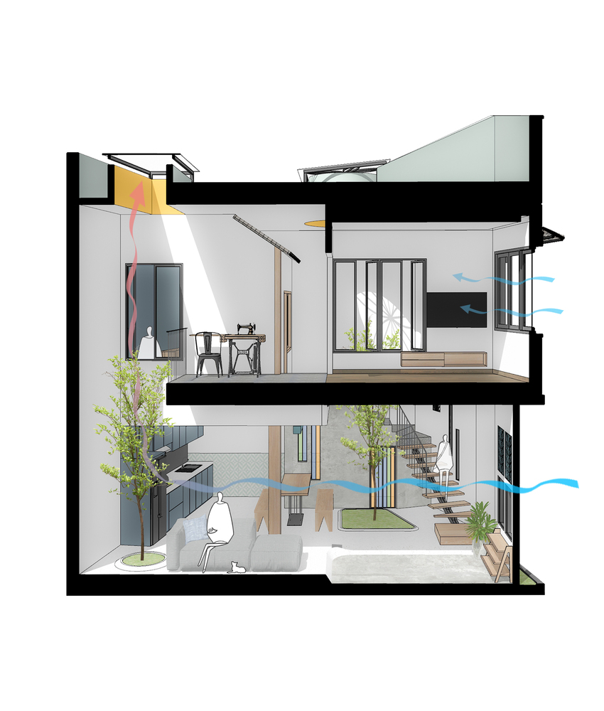 Diện tích ngôi nhà nhỏ và bố trí xéo nên được tận dụng tối đa để làm cho không gian của ngôi nhà trở nên rộng rãi hơn. Bên cạnh đó, khi tạo không gian mở, tất cả các phòng trong nhà được kết nối với nhau bằng hai sân thượng chiếm 1/3 diện tích nhà. Không gian này kết hợp với cây xanh đóng vai trò là lá phổi tự nhiên hoạt động liên tục cả ngày.