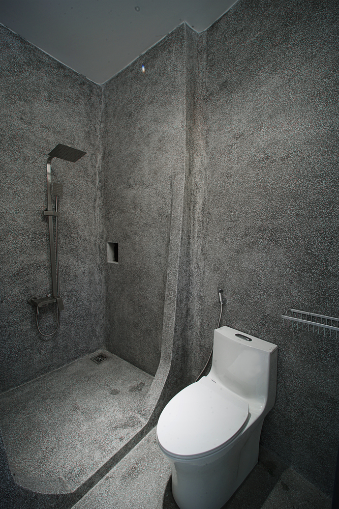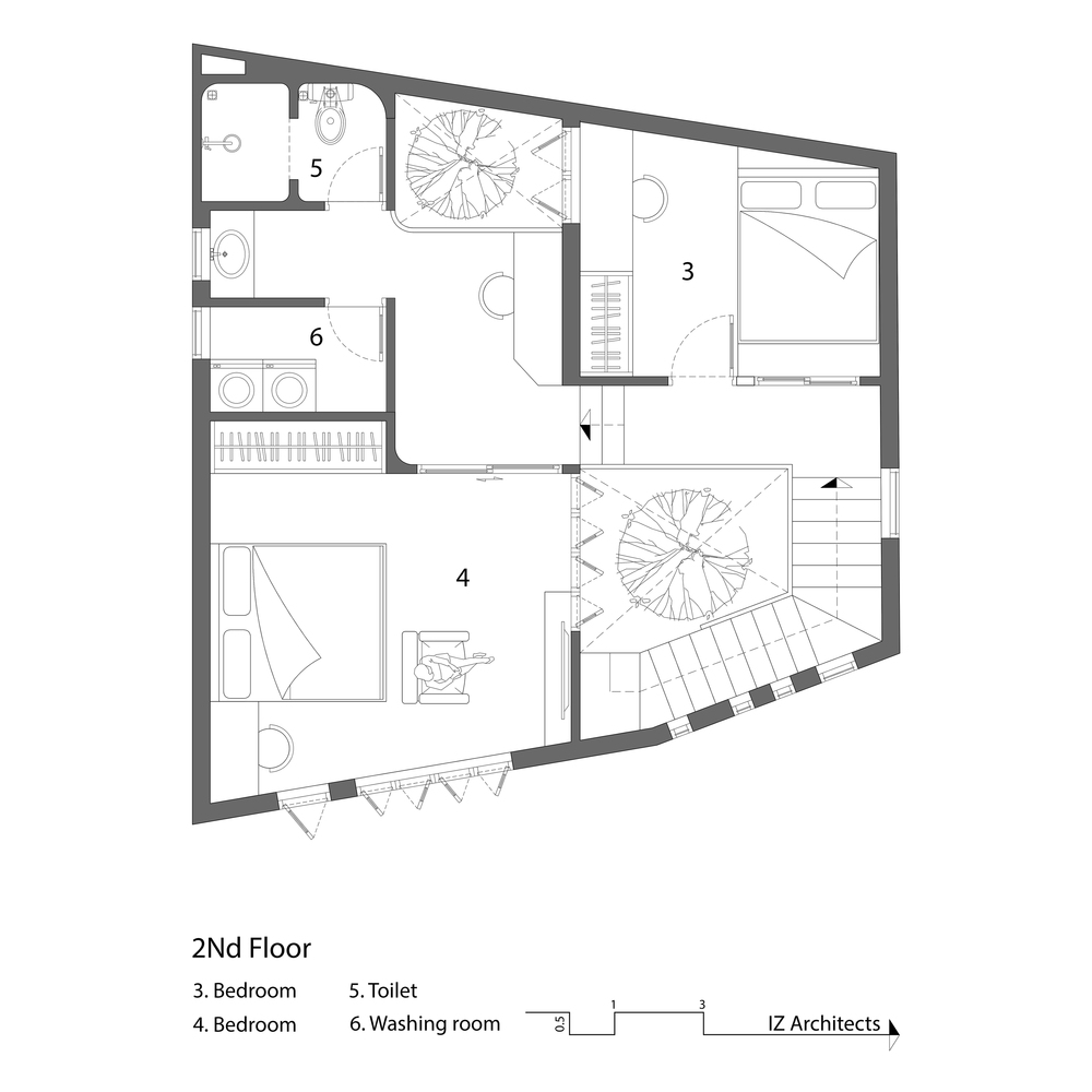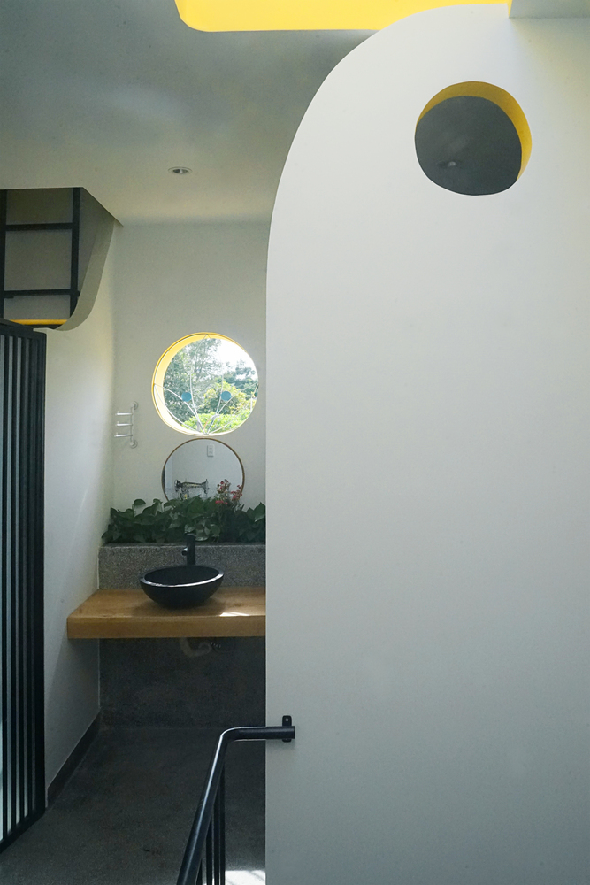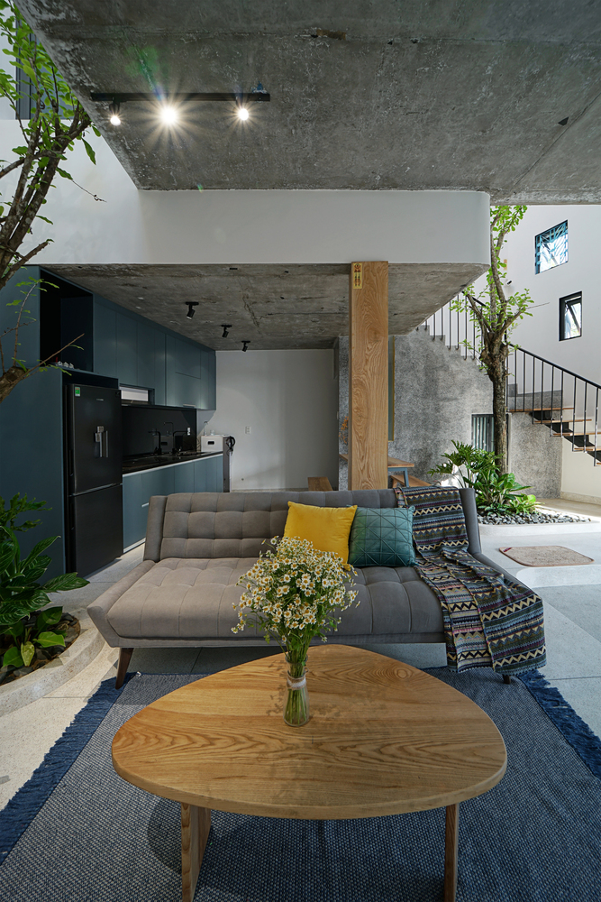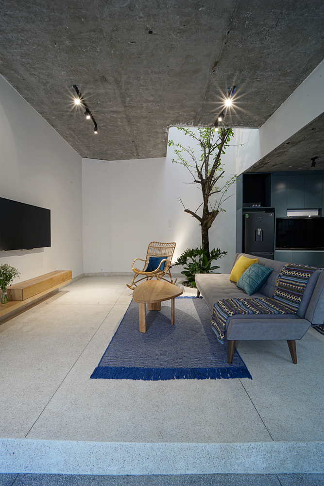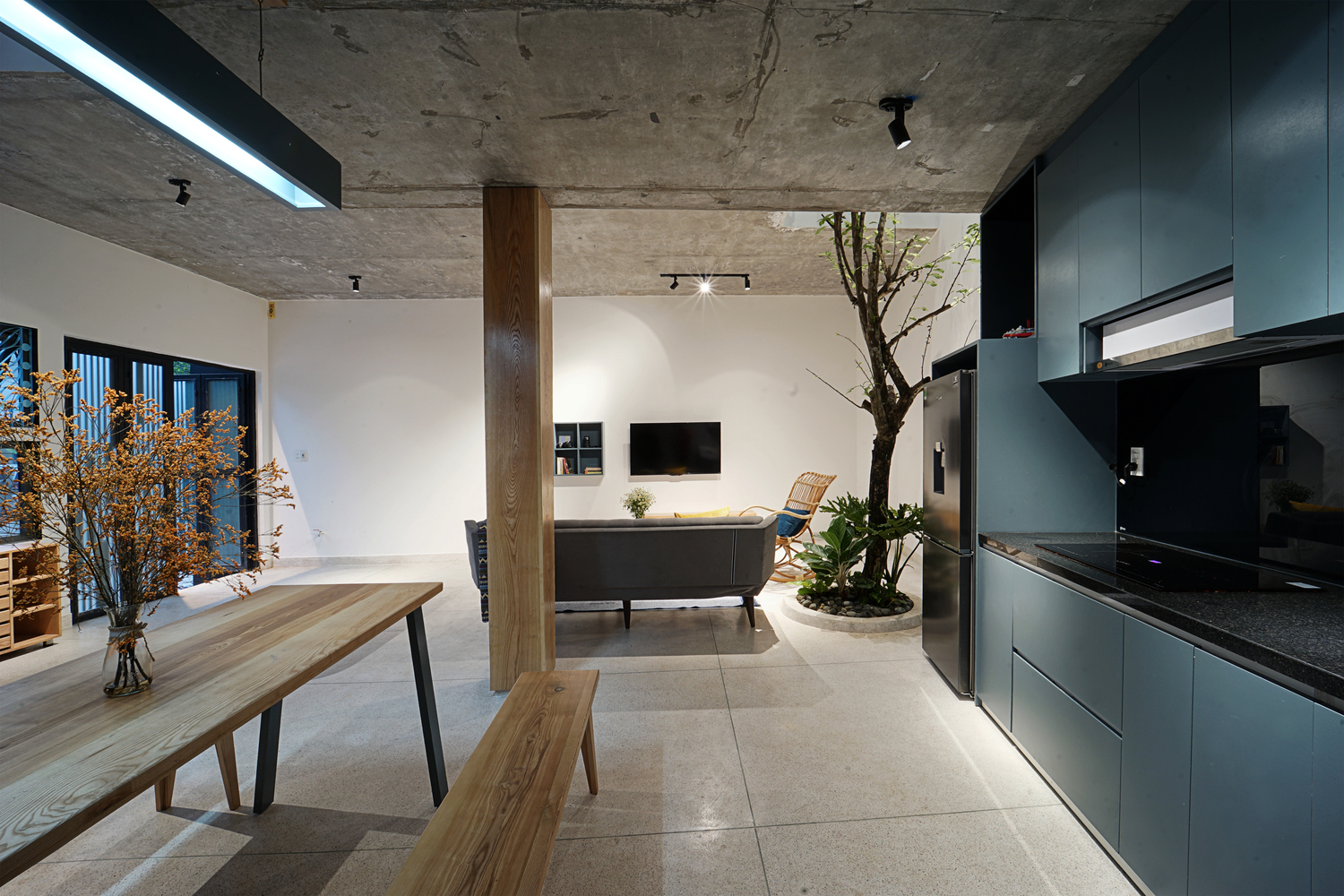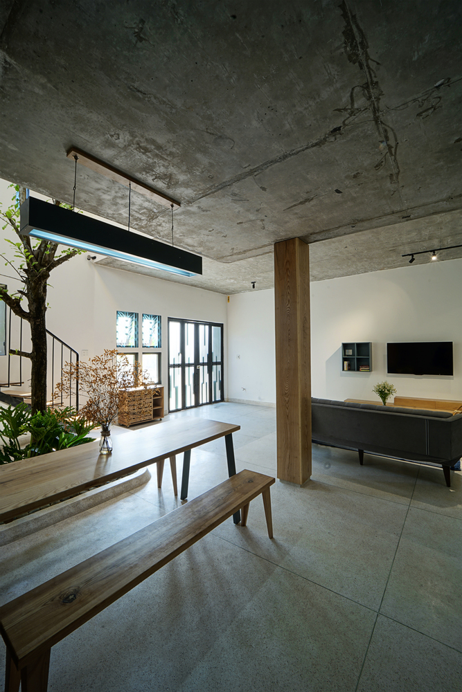 Diện tích ngôi nhà nhỏ và bố trí xéo nên được tận dụng tối đa để làm cho không gian của ngôi nhà trở nên rộng rãi hơn. Bên cạnh đó, khi tạo không gian mở, tất cả các phòng trong nhà được kết nối với nhau bằng hai sân thượng chiếm 1/3 diện tích nhà. Không gian này kết hợp với cây xanh đóng vai trò là lá phổi tự nhiên hoạt động liên tục cả ngày.