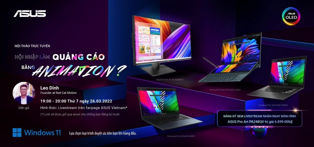 Đối với những bạn theo dõi Hội thảo “Hội nhập làm quảng cáo bằng Animation” chắc chắn sẽ không xa lạ với hình ảnh anh Leo Dinh trải nghiệm thực tế với chiếc máy ASUS VivoBook Pro 14X OLED M7400. Anh Leo cho biết “với màn hình OLED độ phân giải 2.8K với độ chính xác màu cao đã giúp tôi rất nhiều trong việc tạo ra các nhân vật hoạt hình chuẩn điện ảnh. Bên cạnh đó, bộ xử lý AMD Ryzen lên đến 8 nhân hiệu năng cao kết hợp card đồ họa rời NVIDIA RTX 3050 mạnh mẽ đã góp phần hiện thực hoá toàn bộ ý tưởng của tôi”. Nói tóm lại, ASUS VivoBook Pro 14X OLED M7400 không chỉ mang đến sự tiện lợi cho người dùng mà còn là đại diện cho những trải nghiệm tối ưu (All-in-one) hỗ trợ tuyệt đối cho những người mới bắt đầu làm công việc sáng tạo nội dung.