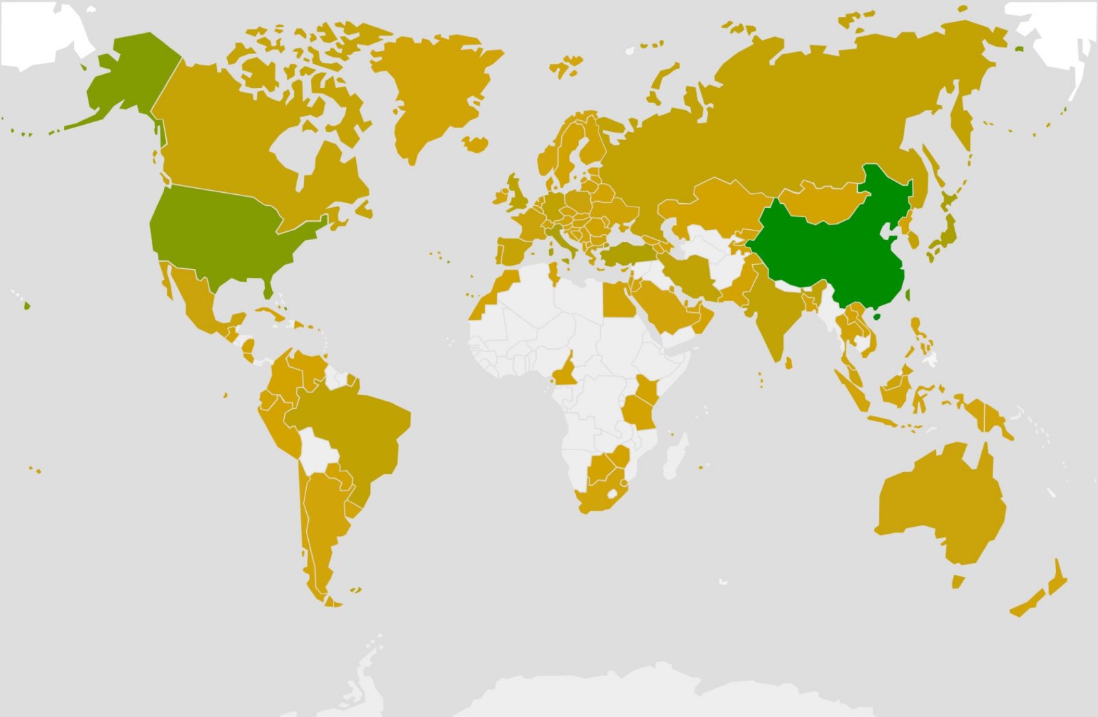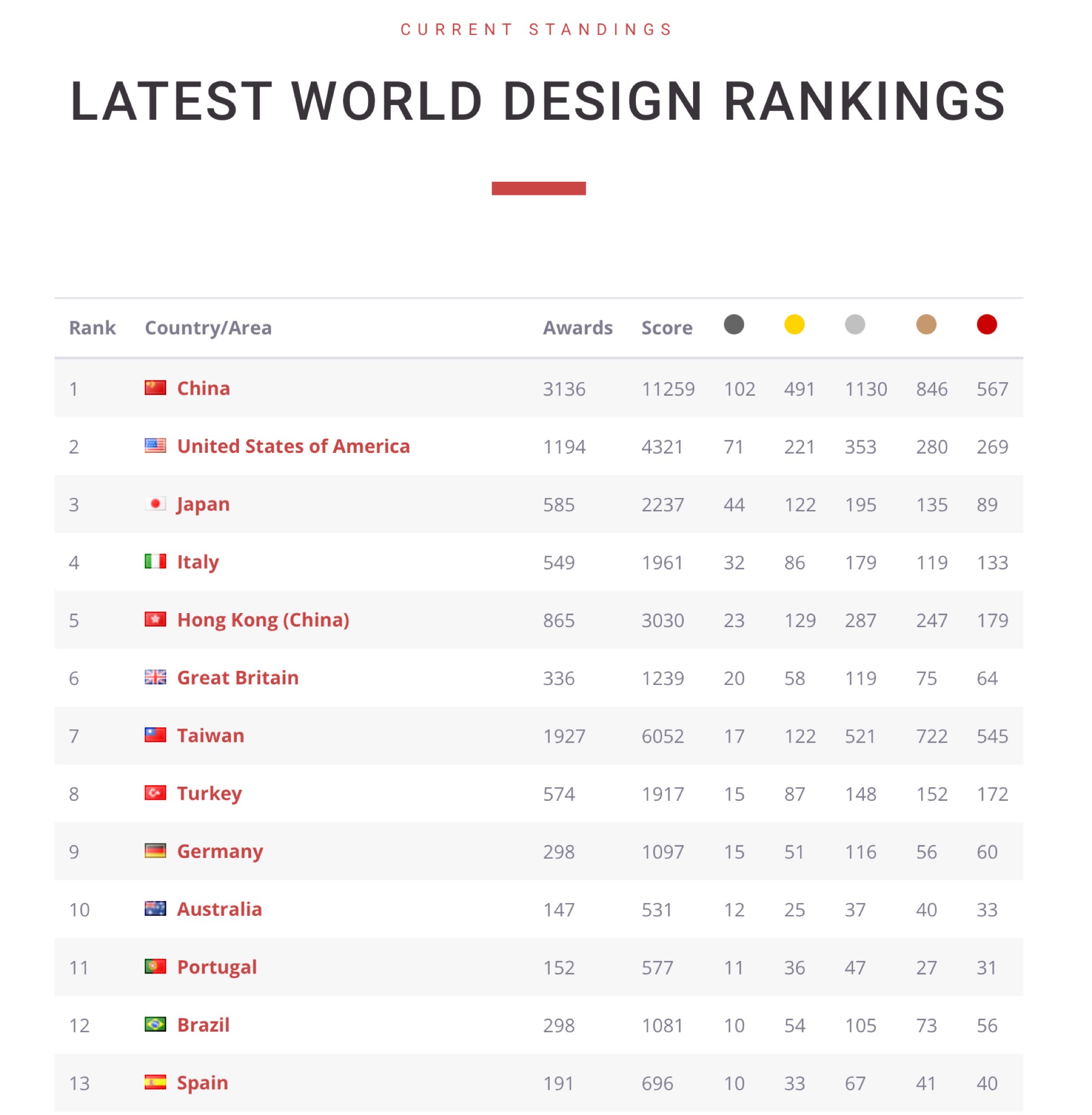 Trong danh sách mới nhất này, Trung Quốc chiếm vị trí dẫn đầu trong số 114 ứng cử viên tham gia, giành được tổng cộng 3.136 giải thưởng kể từ năm 2010, theo sau bởi Hoa Kỳ, Nhật Bản, Ý, Hồng Kông, Vương quốc Anh, Đài Loan, Thổ Nhĩ Kỳ, Đức và Úc.