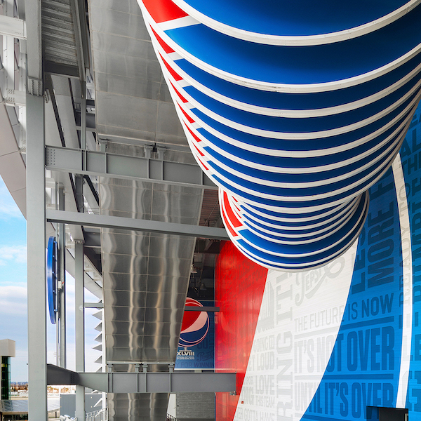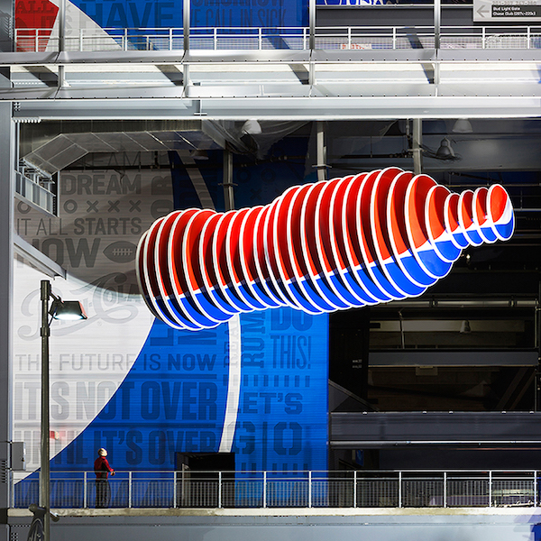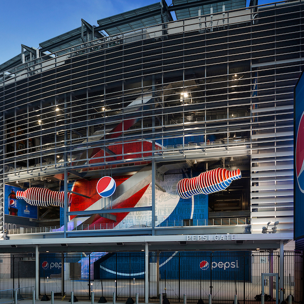 Hai tác phẩm điêu khắc lấy cảm hứng từ hình dạng và màu sắc của chai Pepsi được đặt ở sảnh chính dẫn vào sân vận động.