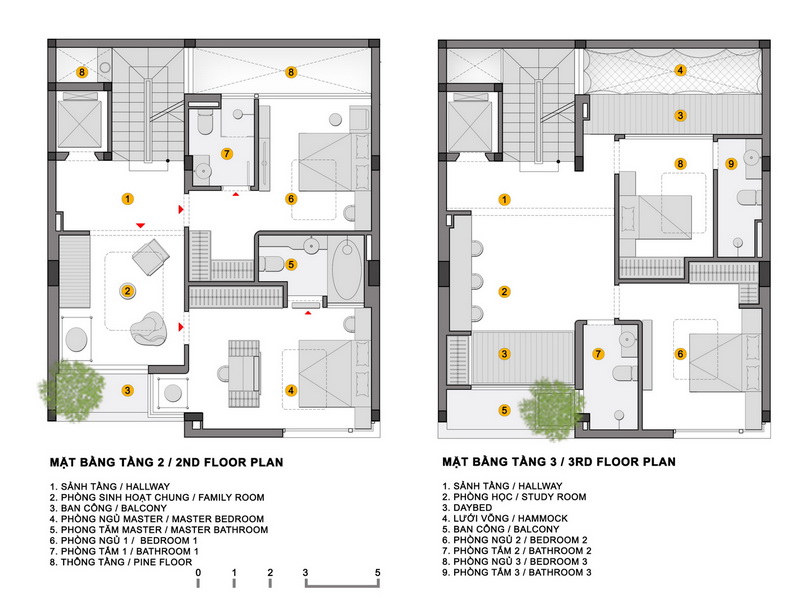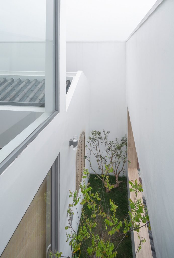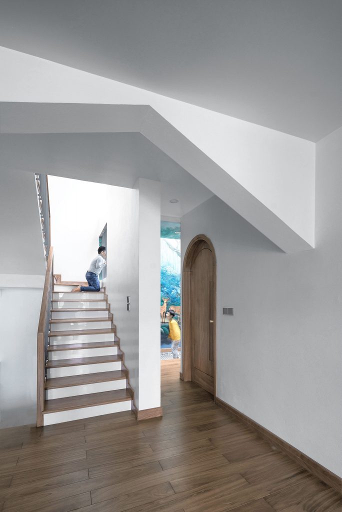 Phía đáy của khu đất được cắt một thông tầng (giếng trời) rộng 90cm kéo dài hết khu đất (11m) để ánh sáng và thông gió cho các phòng ngủ, phòng sinh hoạt chung ở phía sau. Tại sàn tầng 3 là tầng dành cho trẻ con tông màu xanh dương. Phần thông tầng được nối với nhau bằng một tấm võng lớn trên mặt sàn, giúp cho bọn trẻ có không gian ngủ, học, chơi rộng rãi, thoải mái và vẫn rất an toàn.