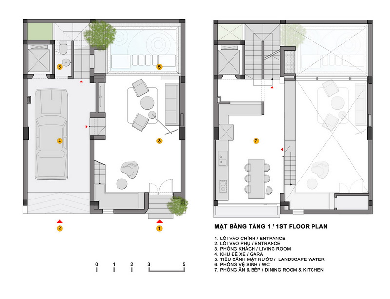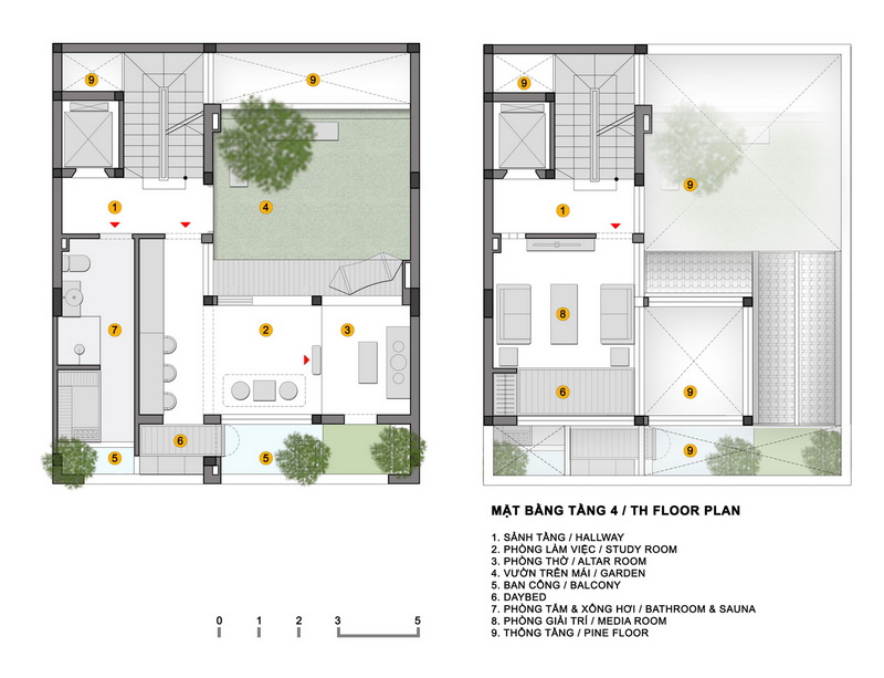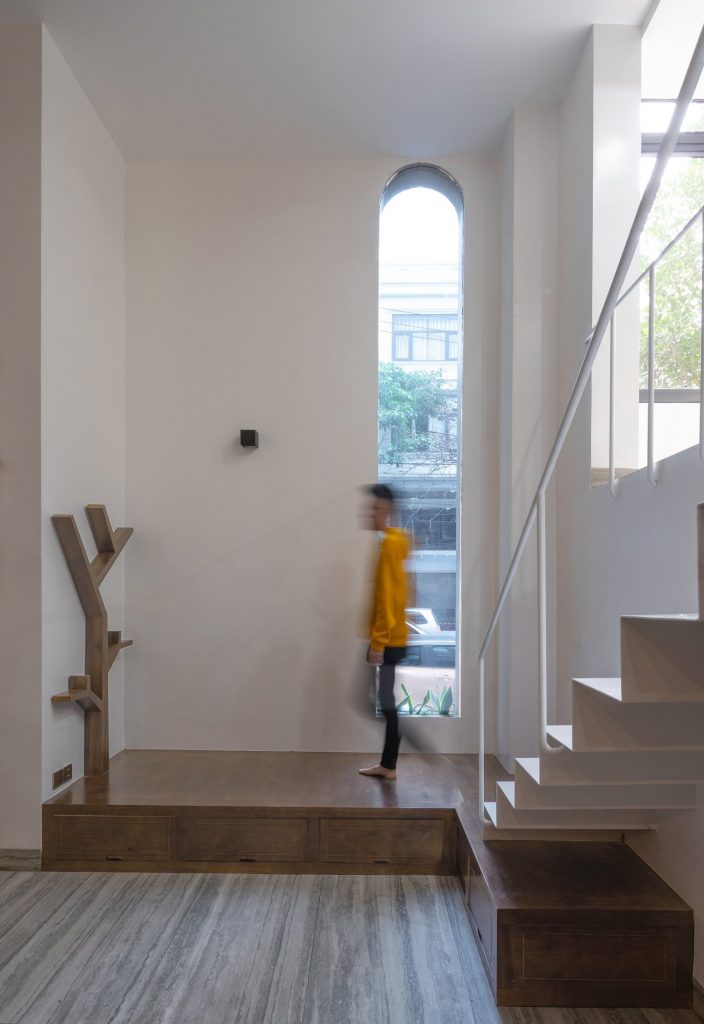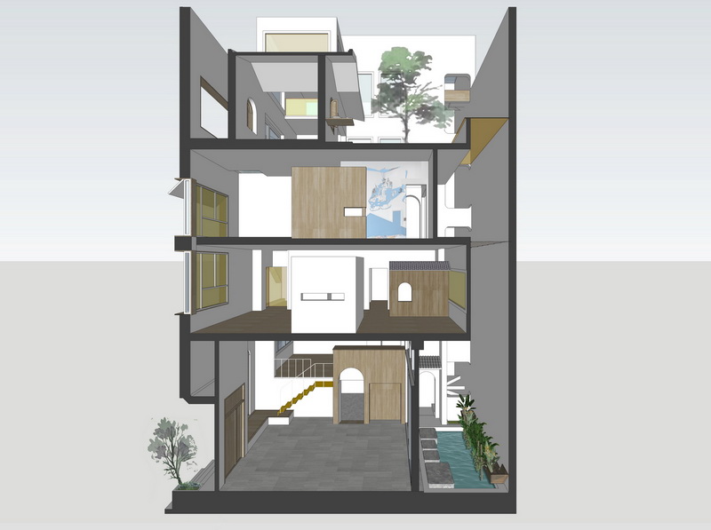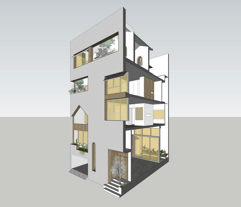 Ngôi nhà này được thiết kế với 3 tầng cho các không gian sinh hoạt tập thể. Tầng 1 dành cho tiếp khách, tầng lửng cho bếp và phòng ăn, tầng 4 là tầng với rất nhiều chức năng như phòng thờ, phòng làm việc, phòng ngủ nhỏ cho khách. Tầng 4 cũng được thiết kế một khu vườn nhiệt đới nhỏ, kết nối với phòng làm việc và phòng thờ. Không gian chuyển tiếp là mái hiên cũng là nơi để chủ nhà uống trà và thiền định vào buổi sáng và tối hoặc khi tiếp các vị khách đặc biệt.