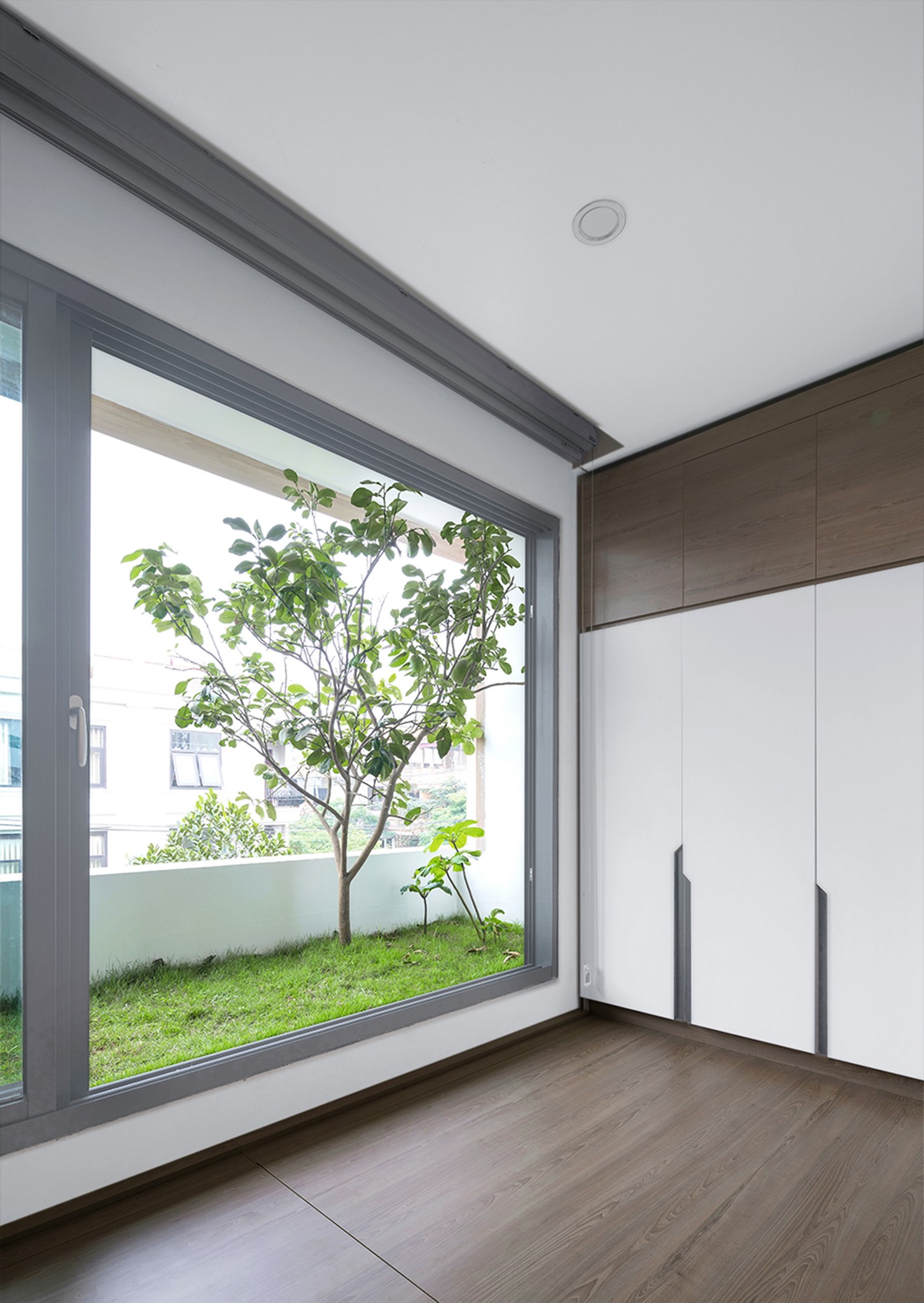 Phía đáy của khu đất được cắt một thông tầng (giếng trời) rộng 90cm kéo dài hết khu đất (11m) để ánh sáng và thông gió cho các phòng ngủ, phòng sinh hoạt chung ở phía sau. Tại sàn tầng 3 là tầng dành cho trẻ con tông màu xanh dương. Phần thông tầng được nối với nhau bằng một tấm võng lớn trên mặt sàn, giúp cho bọn trẻ có không gian ngủ, học, chơi rộng rãi, thoải mái và vẫn rất an toàn.