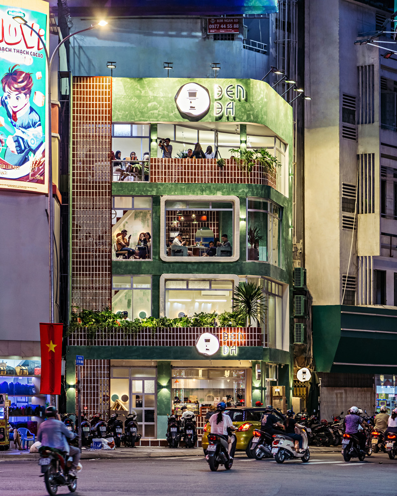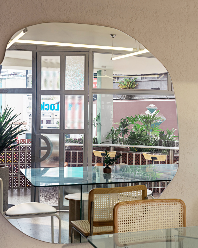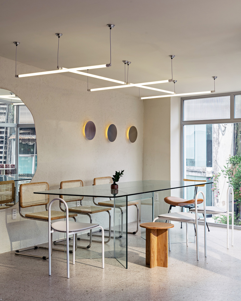 Đầu tiên, yếu tố quan trọng nhất chính là kết cấu tổng thể của dự án, các ô cửa sổ được căn chỉnh riêng biệt như ở tòa nhà nổi tiếng số 42 Nguyễn Huệ. Đi qua không gian cửa hàng là đá mài và gạch lát bậc tam cấp được sắp xếp trang nhã – hai chất liệu chủ yếu được sử dụng trong các hộ gia đình Sài Gòn xưa.