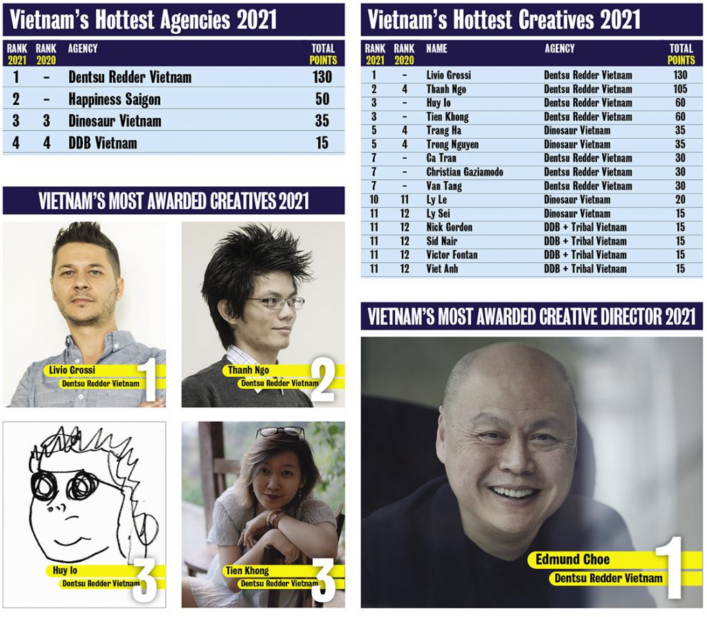 Happiness Saigon đứng ở vị trí thứ 2 trong bảng xếp hạng này, Dinosaur giữ vị trí thứ 3 và DDB ở vị trí thứ 4. Cả Dinosaur và DDB đều giữ nguyên vị trí của mình từ năm 2020. Ki Saigon được xếp hạng nhất năm ngoái đã không xuất hiện trong Bảng xếp hạng Sáng tạo năm nay.
