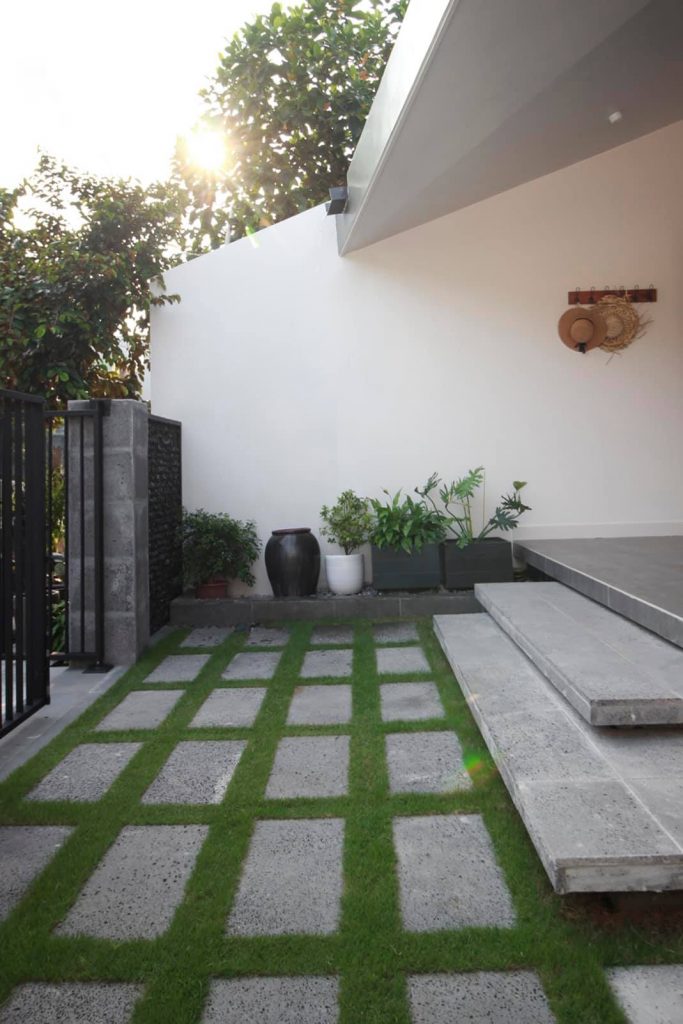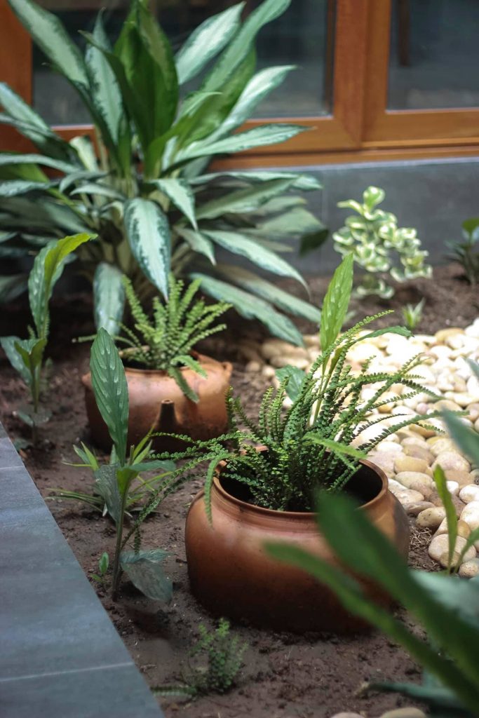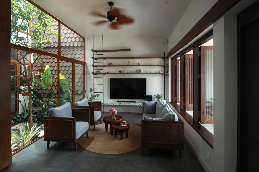 Ngôi nhà sử dụng các vật liệu truyền thống một cách vừa quen vừa lạ. Ngói mũi hài ốp dọc tường như cánh chim hạc, tường rào nhốt đá suối để cây cỏ có thể sinh trưởng qua thời gian, gạch ốp từ làng cổ Bát Tràng, gạch họa tiết hoa sen thời Lý…