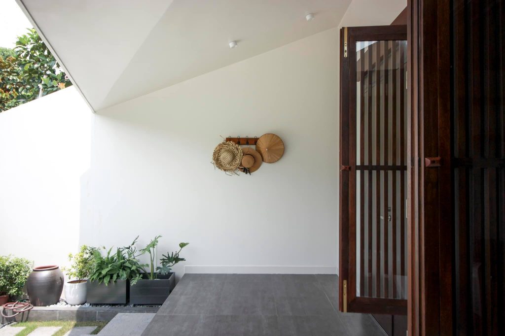 Được thiết kế bởi đội ngũ KTS của Kiến trúc Nhà của Gió, ngôi nhà 1,5 tầng hiền hòa nép mình giữa những tán cây, lấy cảm hứng từ nếp nhà nông thôn truyền thống. Điểm nhấn là mái nhà dốc xòe rộng, mái được đổ bê tông, chống nóng cẩn thận và lát đá, góc mái “vén” lên để đón hướng gió mát thổi vào nhà. Chống đỡ mái là cột được ốp gỗ ngoài trời như thân cây đỡ lấy ngôi nhà.