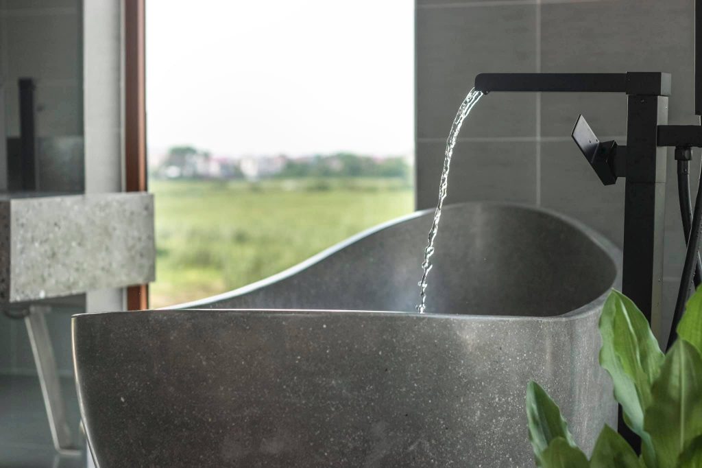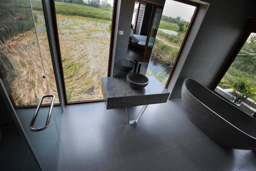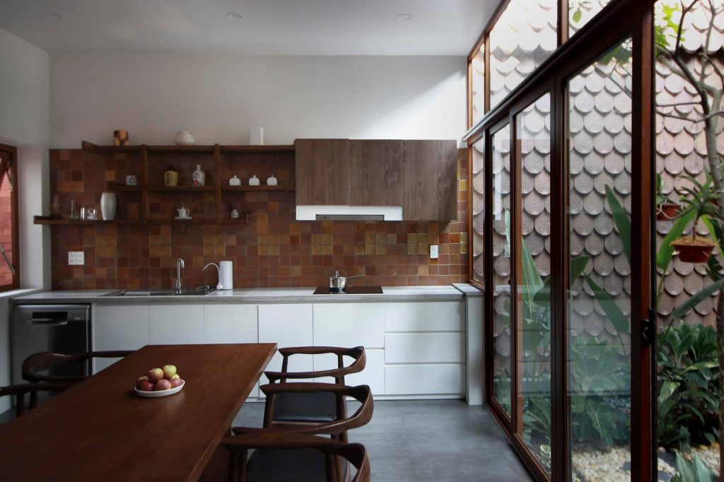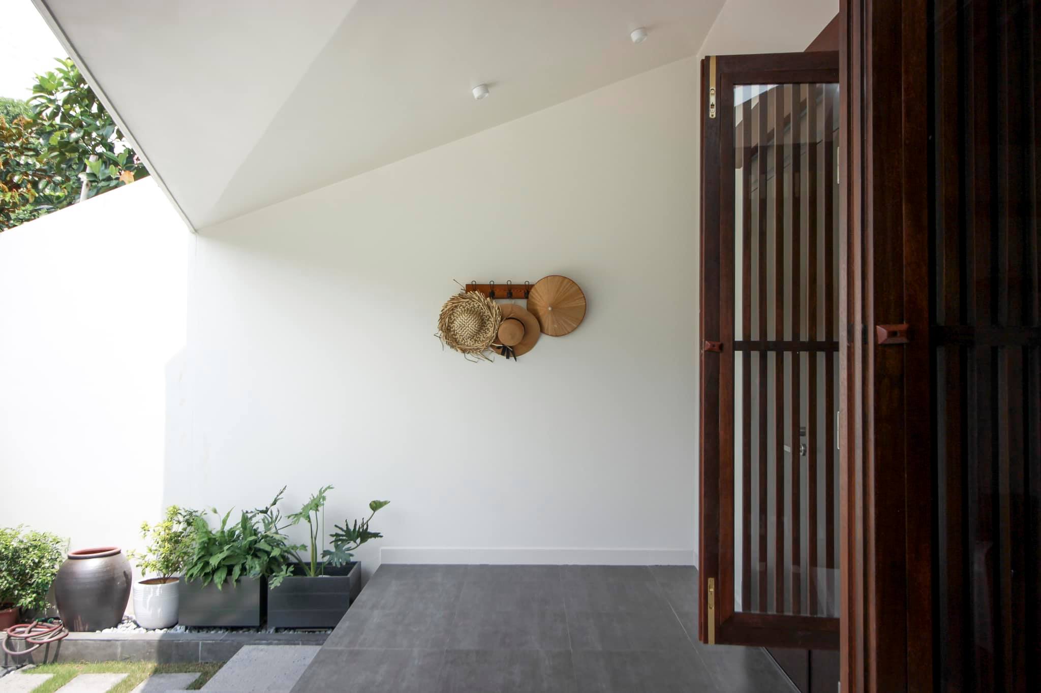 Ngôi nhà sử dụng các vật liệu truyền thống một cách vừa quen vừa lạ. Ngói mũi hài ốp dọc tường như cánh chim hạc, tường rào nhốt đá suối để cây cỏ có thể sinh trưởng qua thời gian, gạch ốp từ làng cổ Bát Tràng, gạch họa tiết hoa sen thời Lý…
