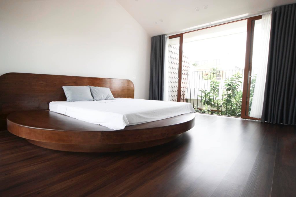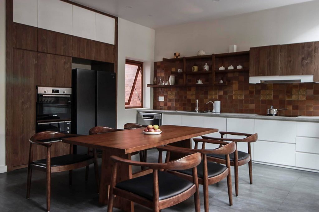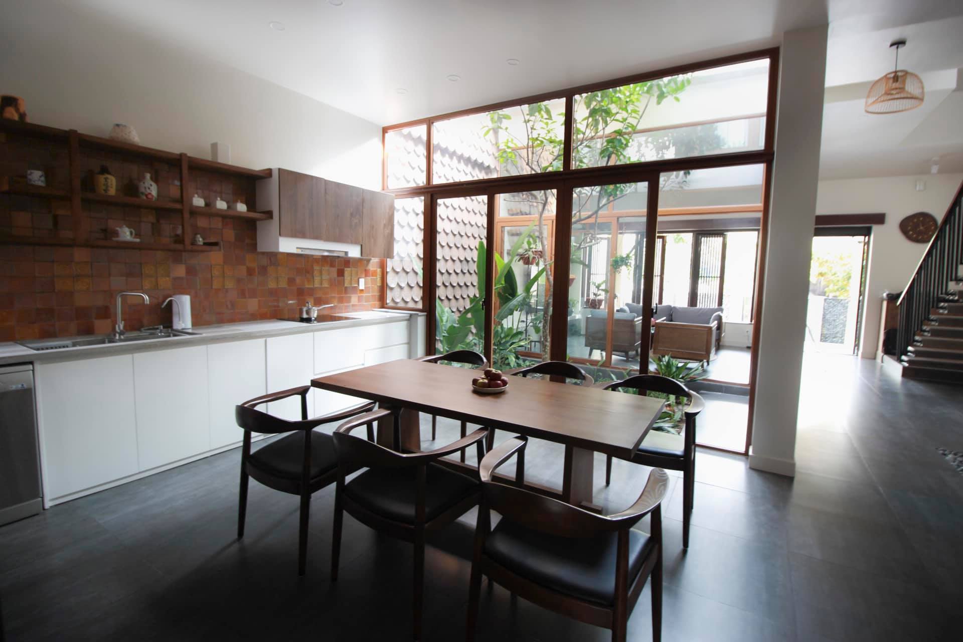 Được thiết kế bởi đội ngũ KTS của Kiến trúc Nhà của Gió, ngôi nhà 1,5 tầng hiền hòa nép mình giữa những tán cây, lấy cảm hứng từ nếp nhà nông thôn truyền thống. Điểm nhấn là mái nhà dốc xòe rộng, mái được đổ bê tông, chống nóng cẩn thận và lát đá, góc mái “vén” lên để đón hướng gió mát thổi vào nhà. Chống đỡ mái là cột được ốp gỗ ngoài trời như thân cây đỡ lấy ngôi nhà.