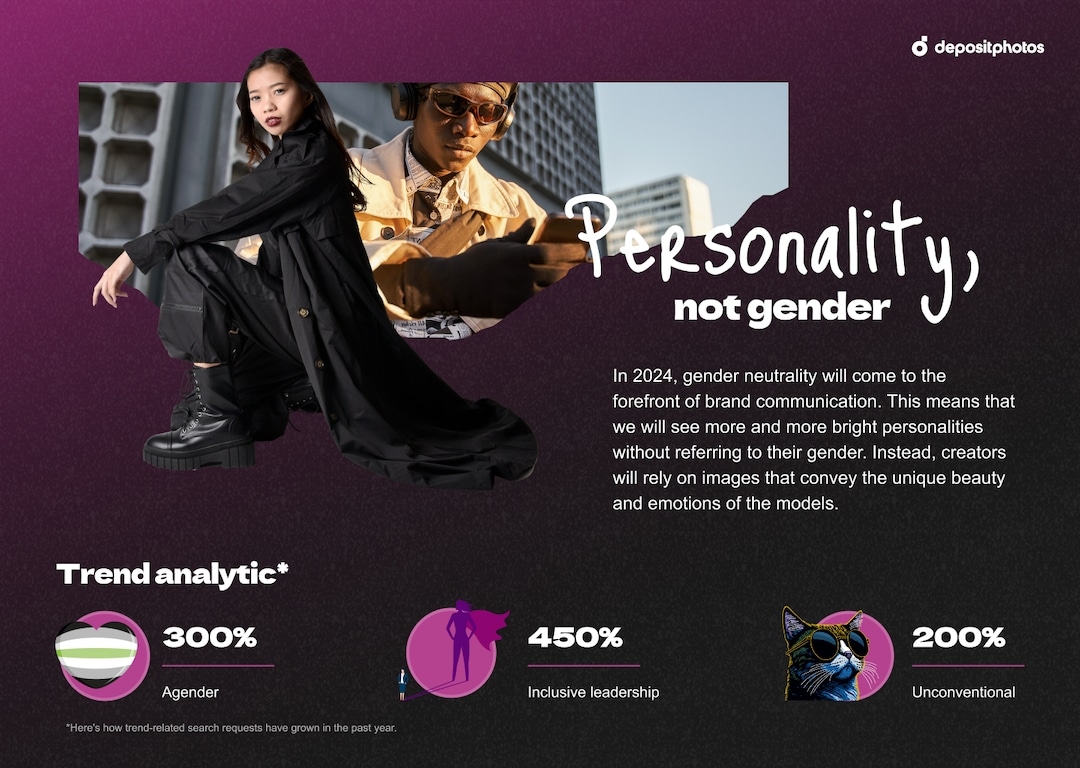 Bản dạng giới không còn là mối quan tâm, mà thay vào đó các giá trị và sự độc đáo của tính cách cá nhân mới được đặt lên hàng đầu. Thương hiệu nên nắm bắt sự đa dạng và thể hiện trạng thái cảm xúc cũng như vẻ đẹp độc đáo của mọi giới tính. Điều này có thể đạt được thông qua các tư thế biểu cảm và sử dụng những bức ảnh nhấn mạnh nhiều cảm xúc và bối cảnh đa dạng.