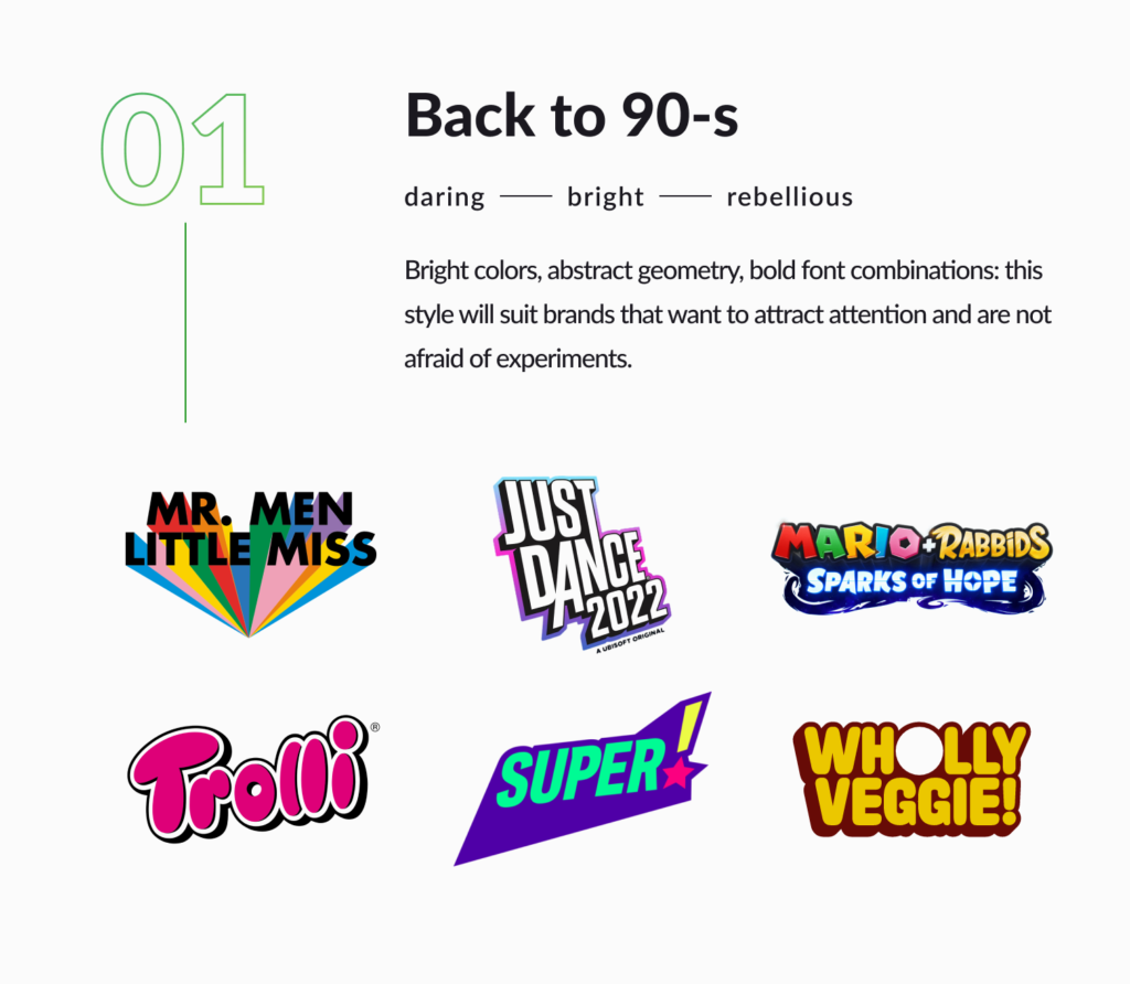 Các màu sắc tươi sáng, hình học trừu tượng, kết hợp font chữ đậm: phong cách này sẽ phù hợp với những thương hiệu muốn thu hút sự chú ý và không ngại thể nghiệm.