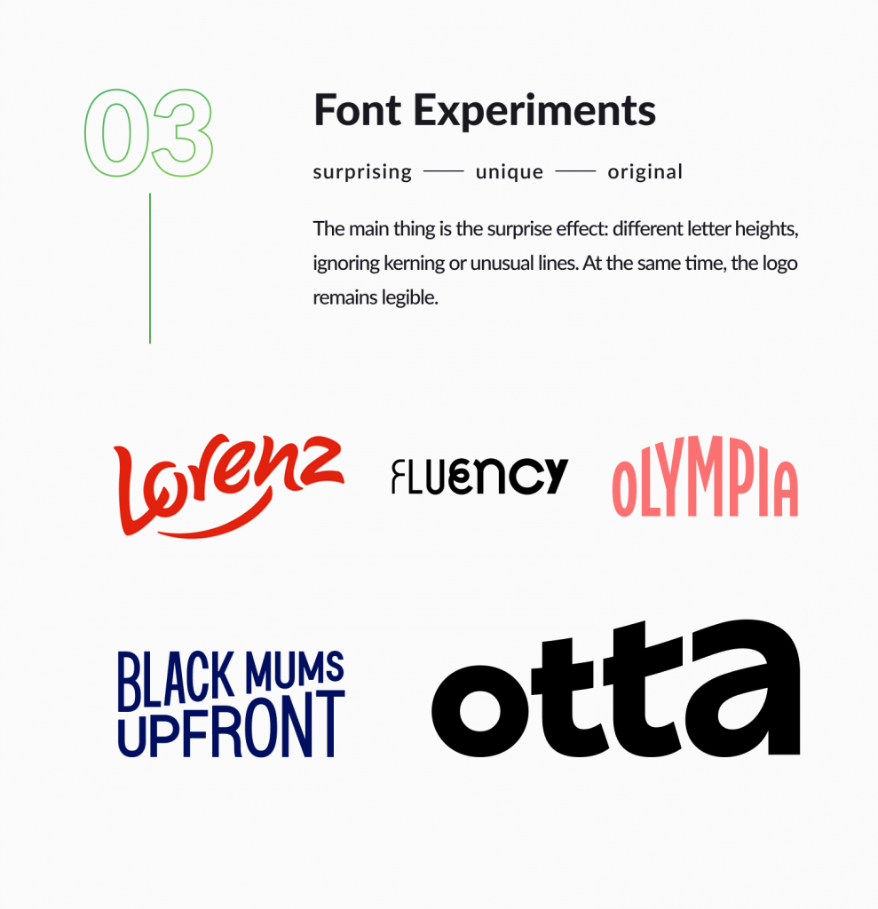 Hiệu ứng bất ngờ chính là chìa khoá: các chữ cái với chiều cao không đồng nhất, bỏ qua việc căn chỉnh kích thước (kerning), hoặc thêm vào các đường nét bất thường. Tuy vậy, logo vẫn dễ đọc.