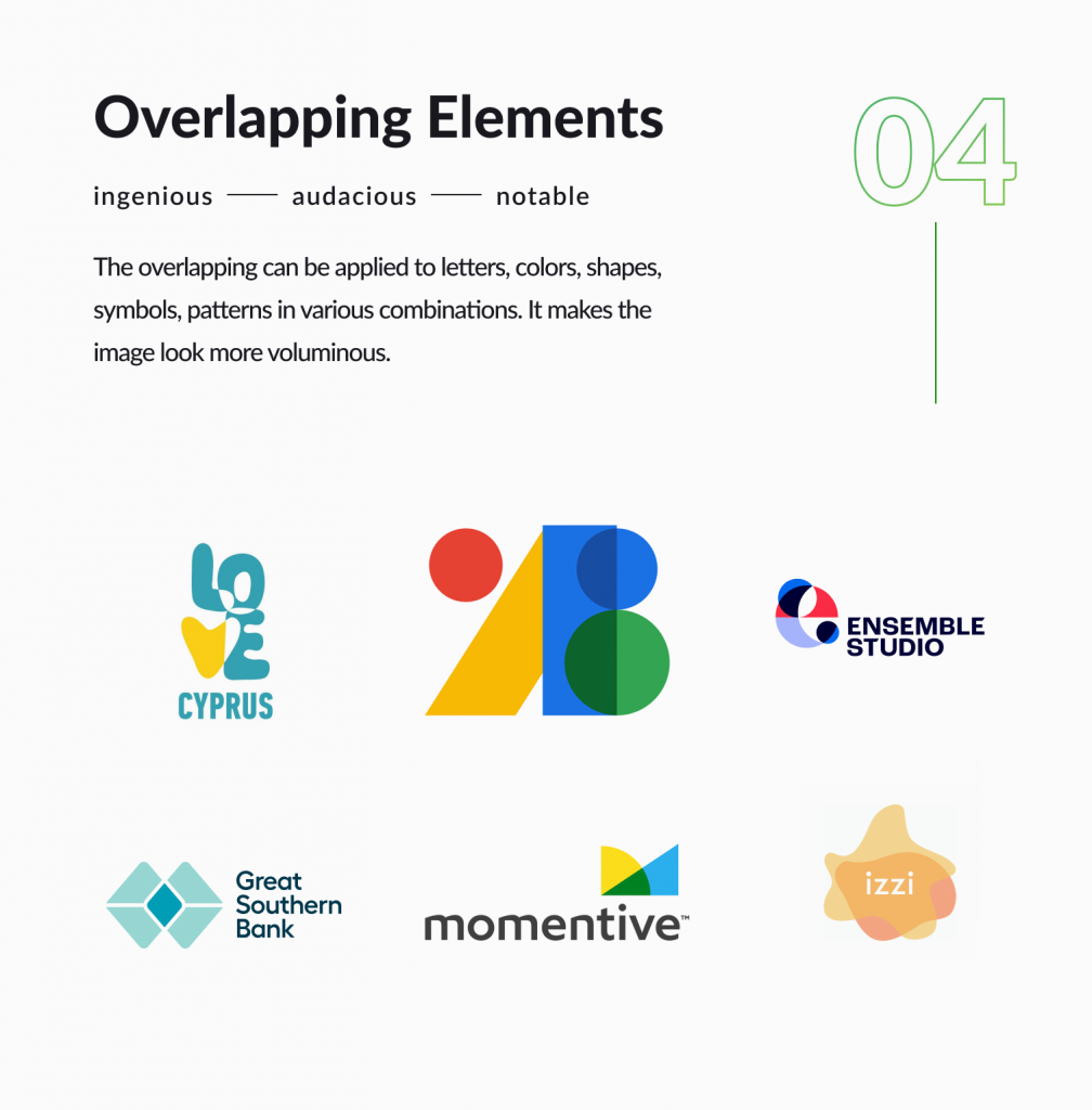 Các yếu tố chồng chéo có thể được áp dụng cho chữ cái, màu sắc, hình dạng, biểu tượng, hoa văn với nhiều cách kết hợp khác nhau. Điều này làm cho hình ảnh trông mạnh mẽ hơn.