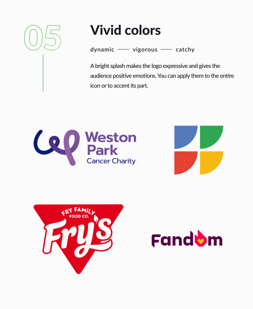 Một điểm sáng đầy màu sắc trong logo sẽ làm cho nó đầy biểu cảm và mang lại cảm xúc tích cực cho khán giả. Bạn có thể áp dụng các màu sắc tươi sáng và sống động vào toàn bộ logo hoặc nhấn mạnh một phần của nó.