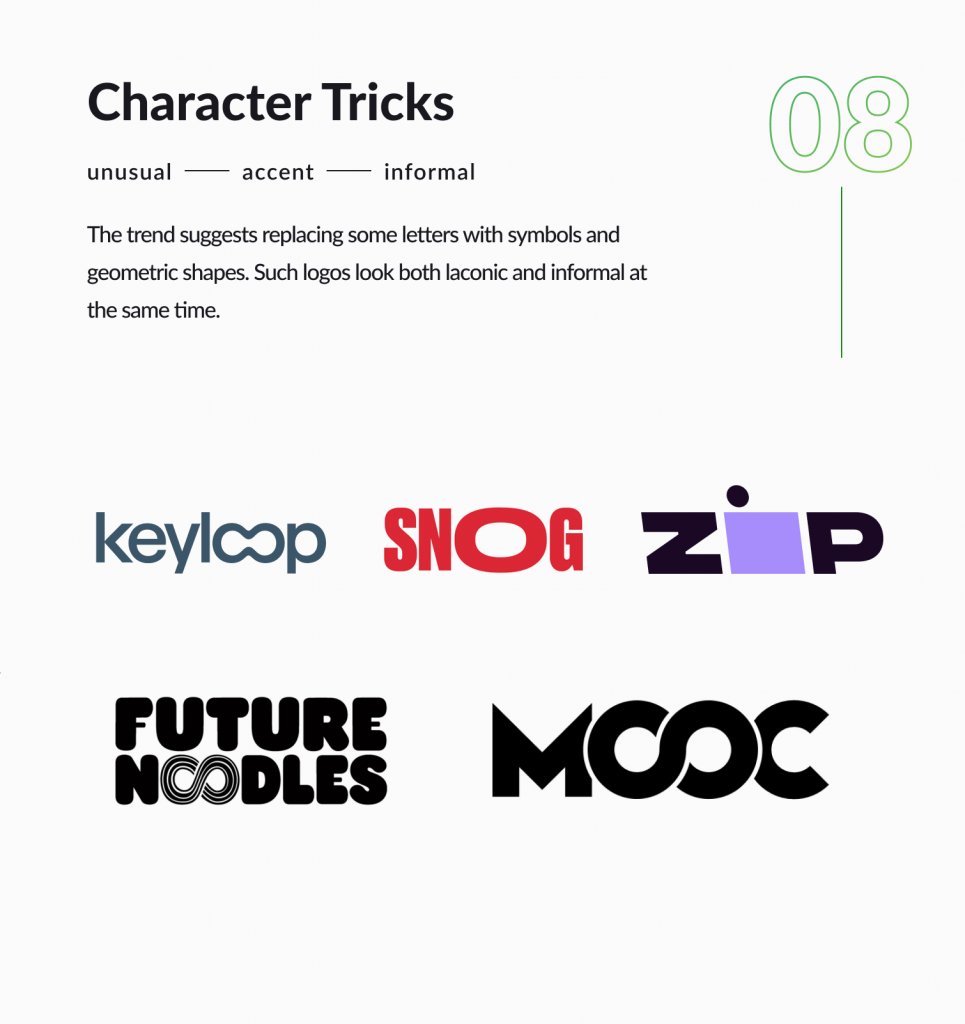 Xu hướng này gợi ý việc thay thế một số chữ cái bằng các biểu tượng và dạng hình học. Các logo được thiết kế với phong cách này trông sẽ ngắn gọn (như phong cách laconic) và tạo cảm giác gần gũi.