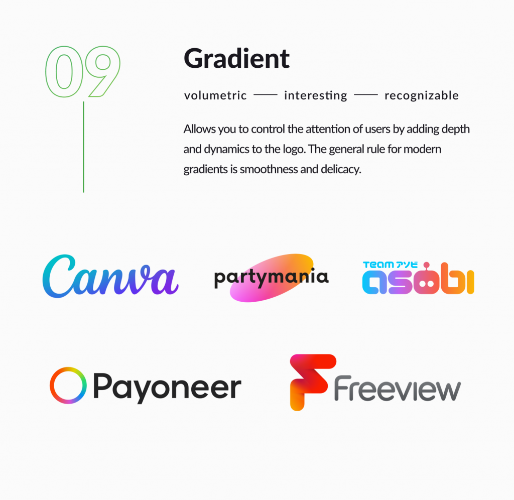 Các nhà thiết kế đồ hoạ hiện nay có rất nhiều cách để cập nhật xu hướng và tạo ra những logo độc đáo với các phong cách thiết kế mới nhất hiện nay. Độ chuyển màu, những font chữ hoa mỹ, thông điệp được mã hoá, các dạng hình học, màu sắc rực rỡ hay hỗn hợp màu lạnh là một số ví dụ cho những phong cách thiết kế logo đang “trending” hiện nay.