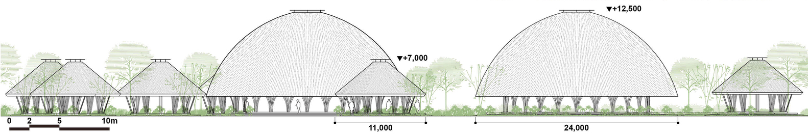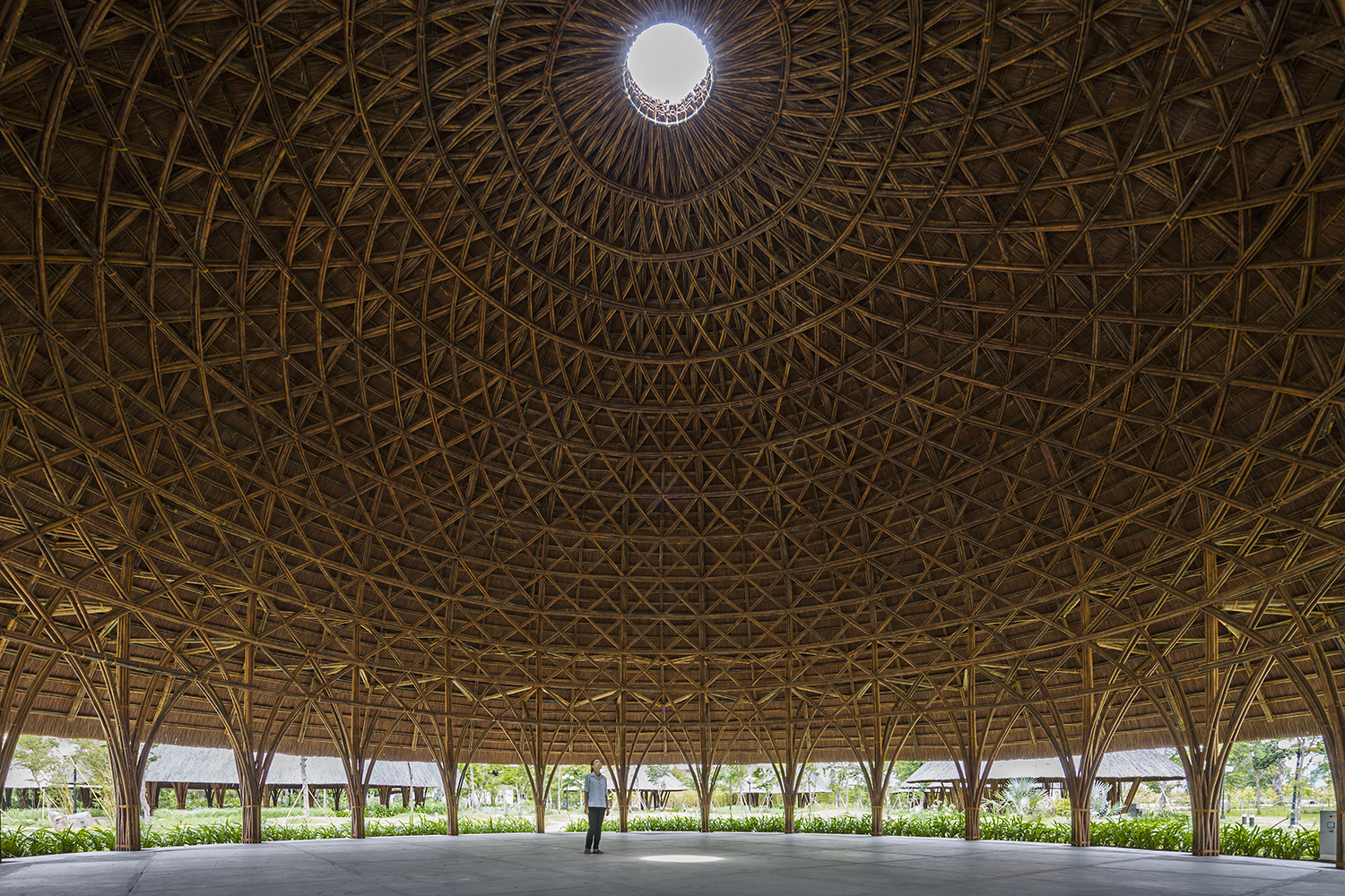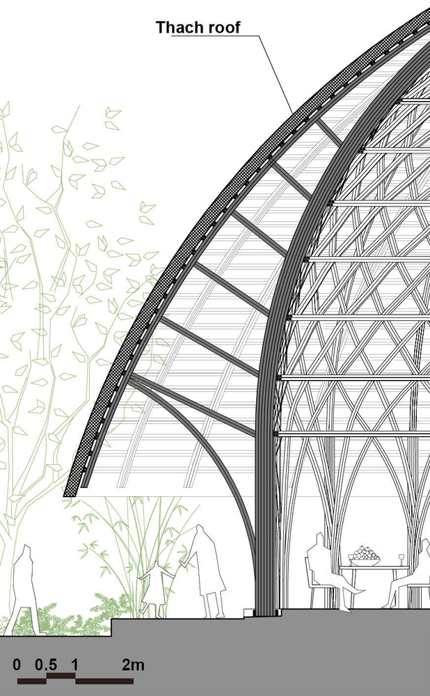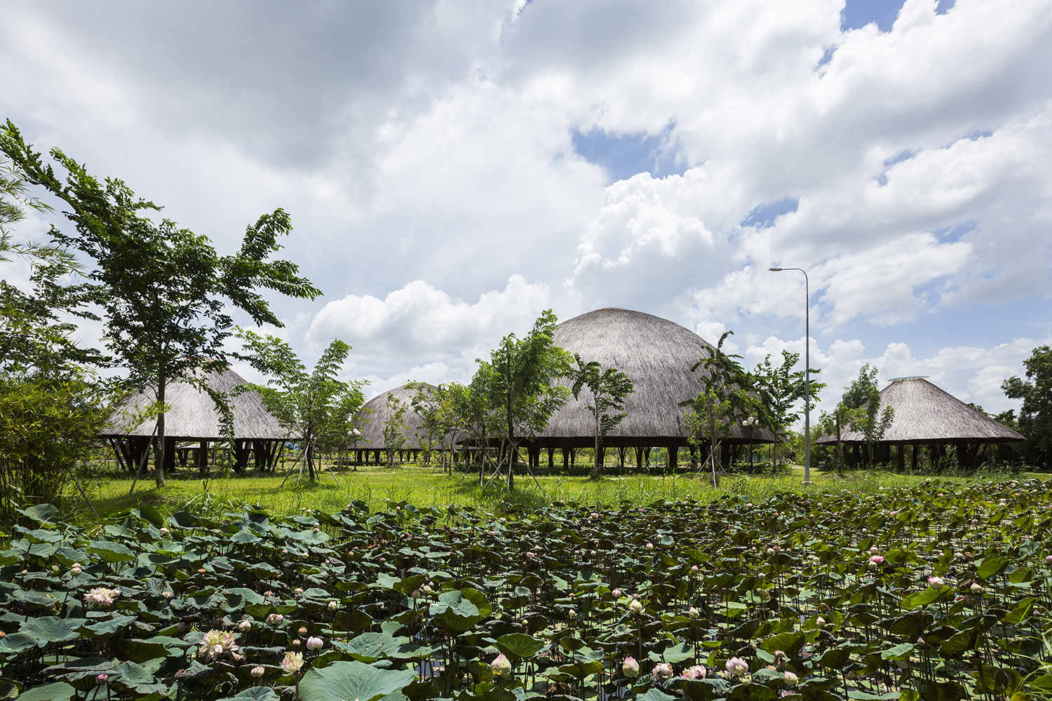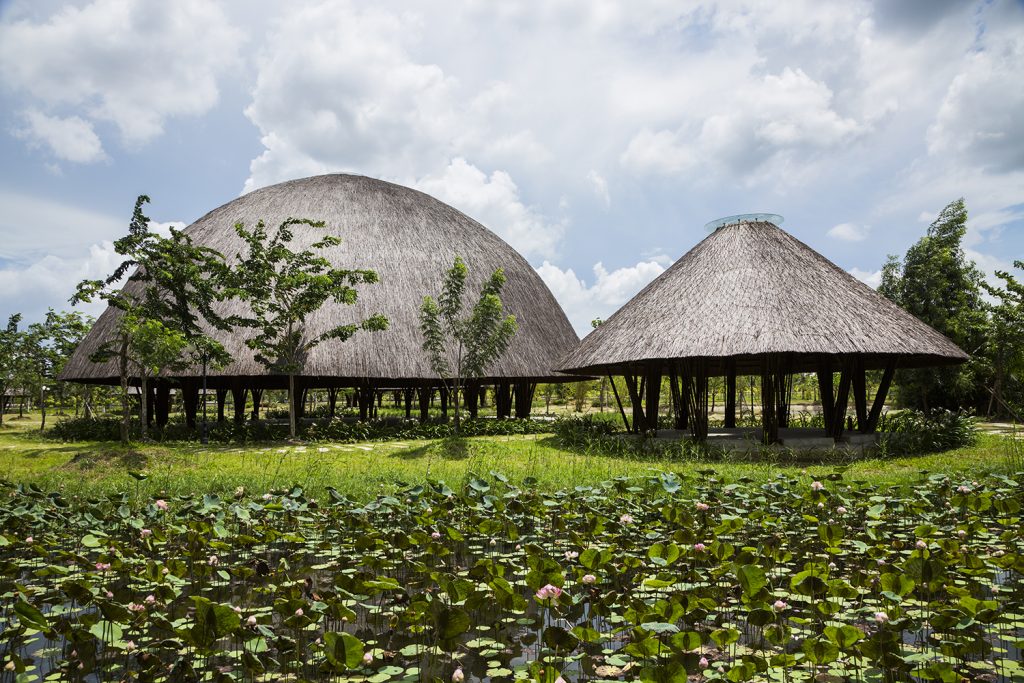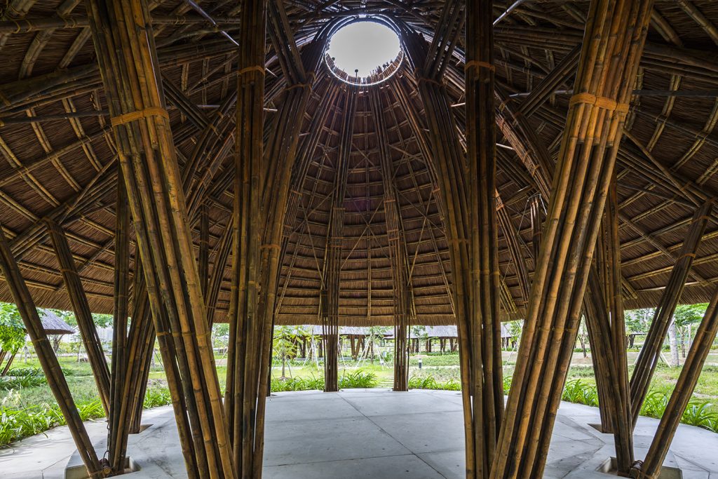 Hai mái vòm lớn được tạo ra bởi cấu trúc hoàn toàn bằng tre với đường kính 24m và cao 12,5m, được lấy cảm hứng từ chiếc bội tre truyền thống dùng để ụp gà. Sáu gian nhà bằng tre nhỏ hơn có hình dáng như những chiếc ô, đường kính 11m, cao 7m. Công trình này được thực hiện bởi những người thợ lành nghề đan từng khúc tre tại chỗ.
