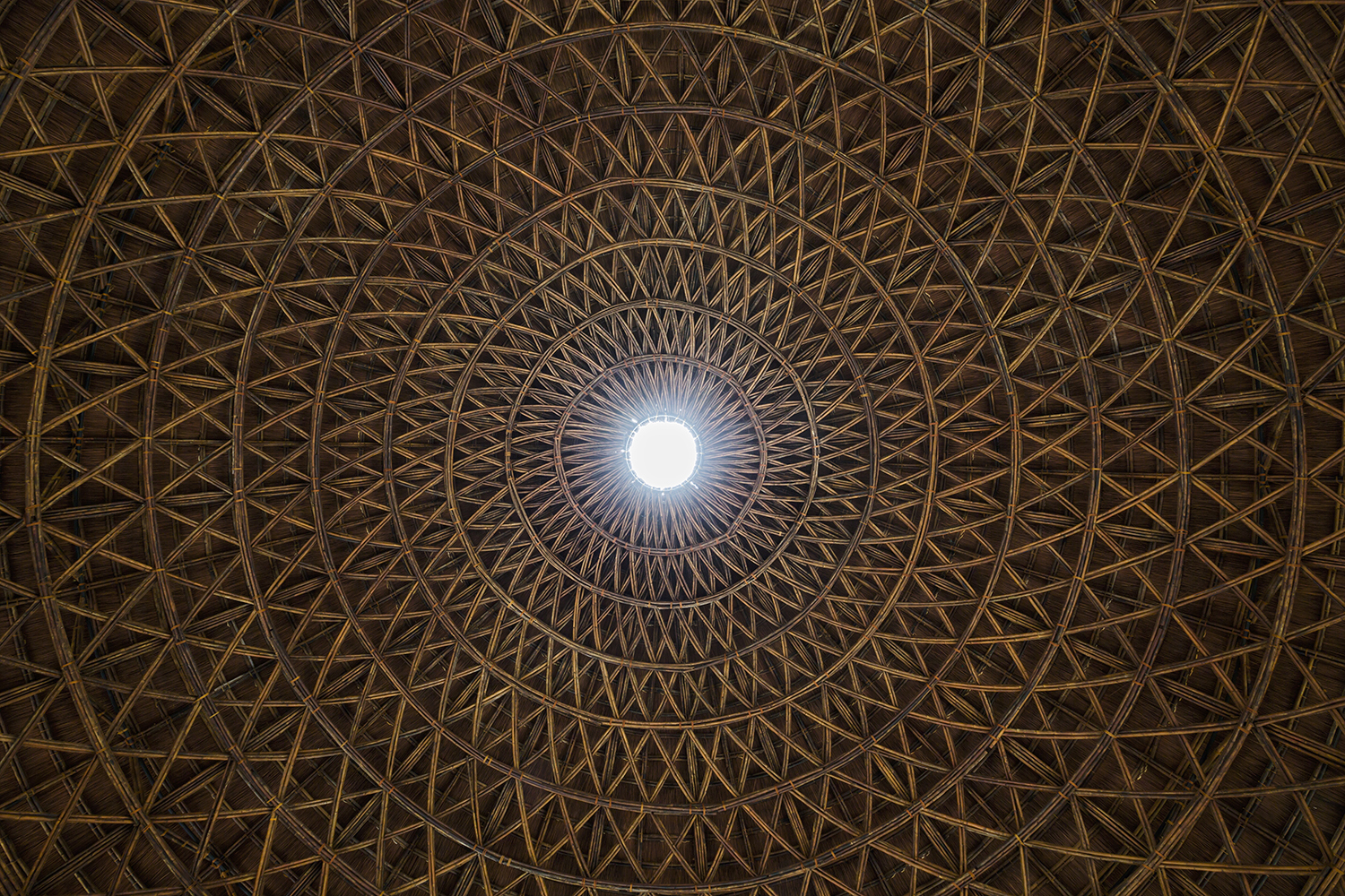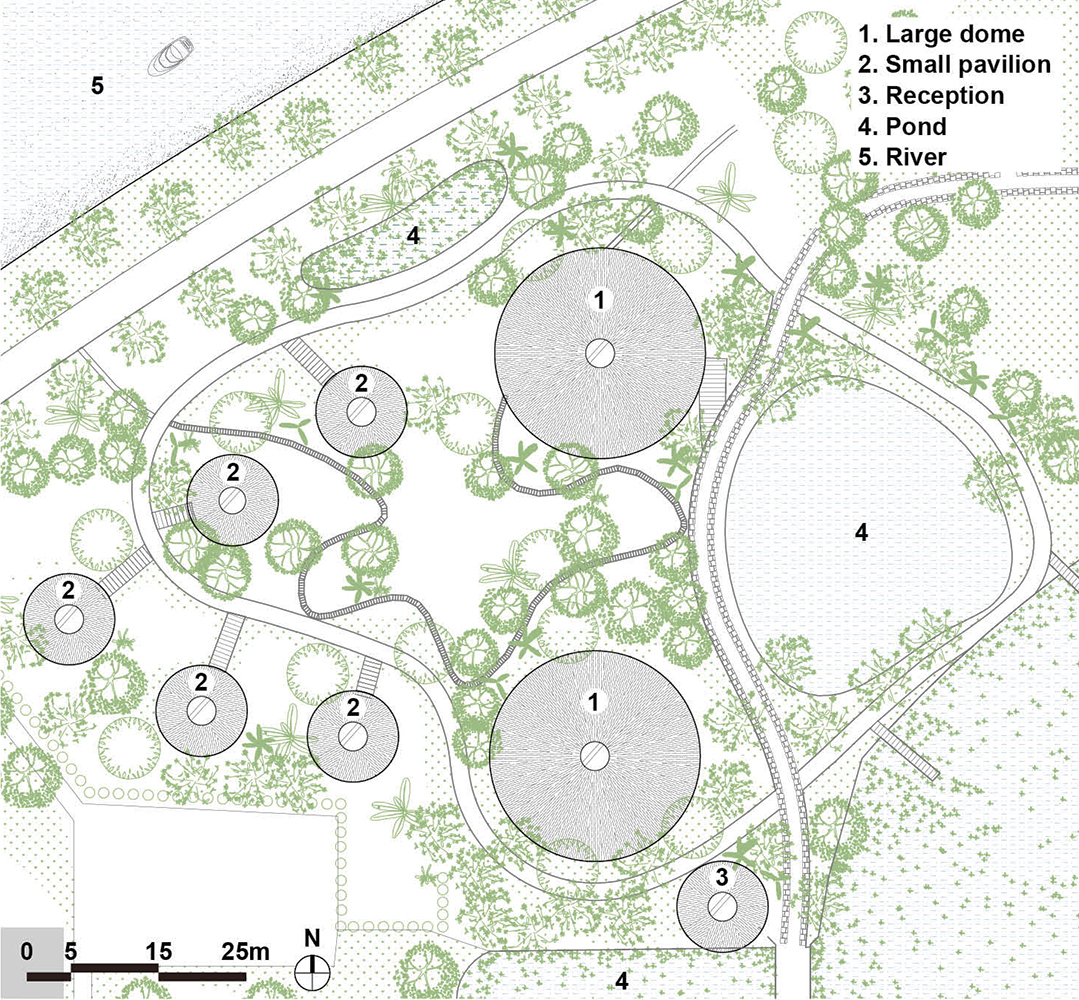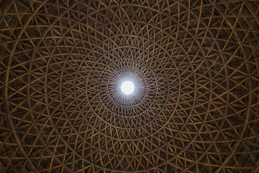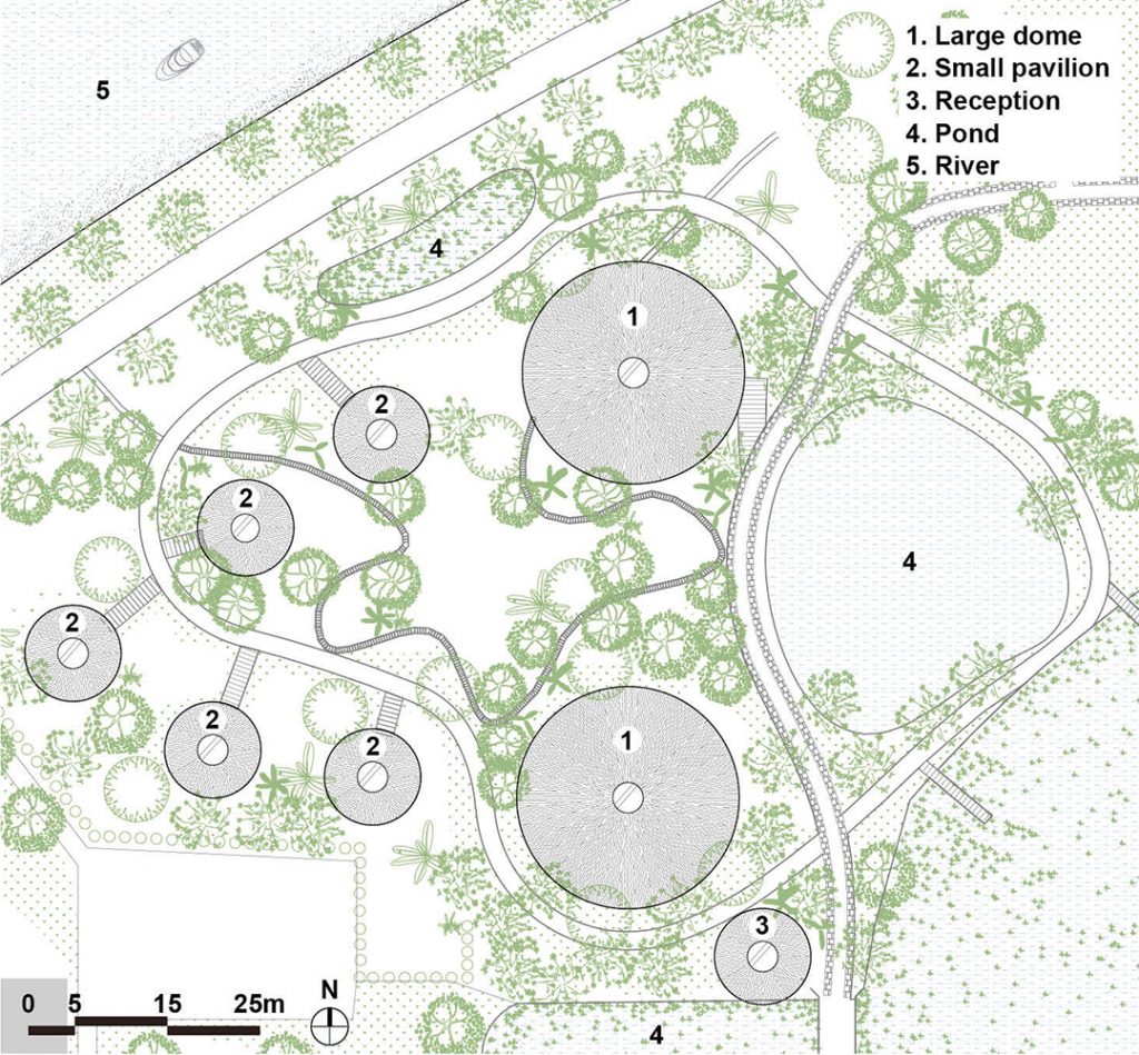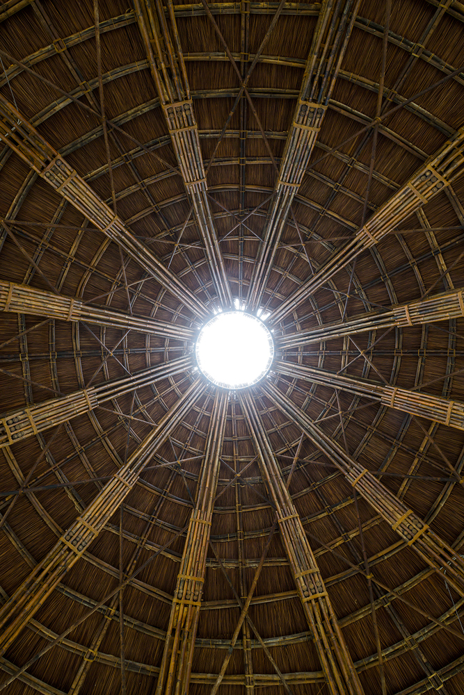 Hai mái vòm lớn được tạo ra bởi cấu trúc hoàn toàn bằng tre với đường kính 24m và cao 12,5m, được lấy cảm hứng từ chiếc bội tre truyền thống dùng để ụp gà. Sáu gian nhà bằng tre nhỏ hơn có hình dáng như những chiếc ô, đường kính 11m, cao 7m. Công trình này được thực hiện bởi những người thợ lành nghề đan từng khúc tre tại chỗ.