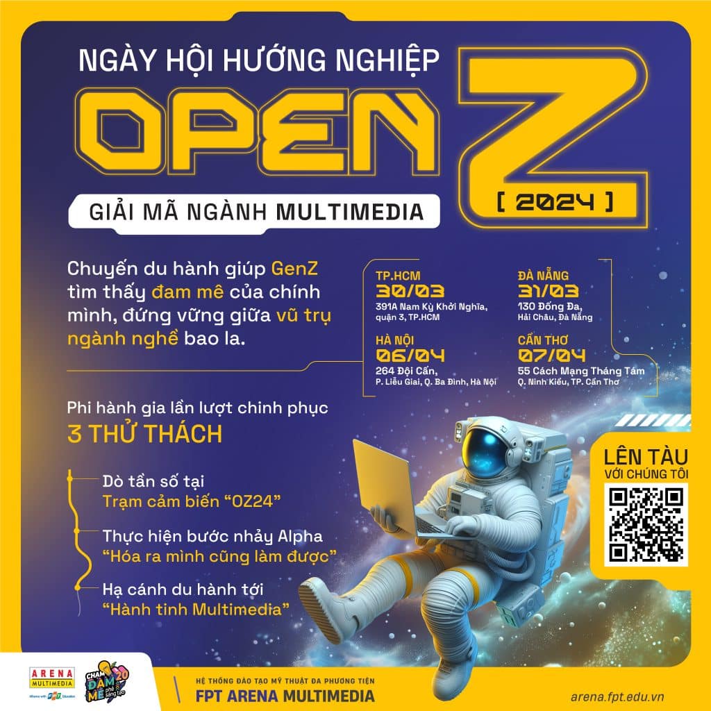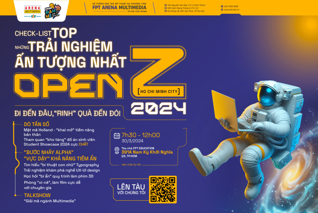 OPEN Z 2024, FPT Arena Multimedia TP.HCM sẽ khai thác sâu hơn về hành trình chọn nghề thông qua 3 cột mốc thử thách lớn: Dò tần số cùng trắc nghiệm Holland để “va chạm” với những điều tinh túy nhà FAN; “Bước nhảy Alpha” vực dậy khả năng tiềm ẩn với loạt hoạt động sáng tạo; Talkshow “Giải mã ngành Multimedia” giúp gen Z lựa chọn “hạ cánh” chuẩn xác giữa vũ trụ ngành nghề bao la.