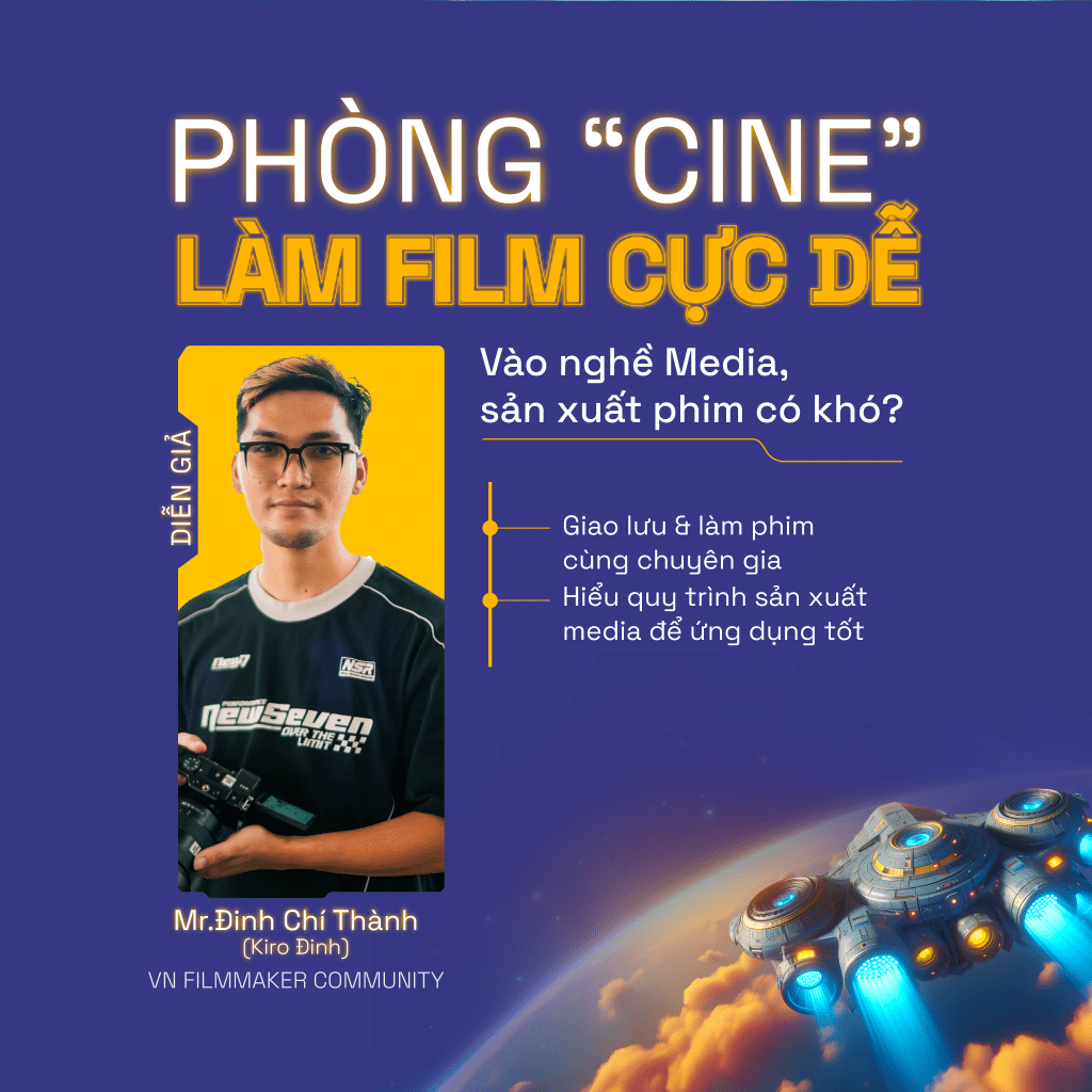 Kiro Đinh cùng ekip tài năng từ cộng đồng VN Filmmaker Community sẽ hướng dẫn cách kể chuyện qua góc máy, cỡ ảnh, ngôn ngữ điện ảnh, kỹ năng research và trải nghiệm đặt bố cục máy tại chỗ với thể loại phim Kỹ thuật số, TVC,…