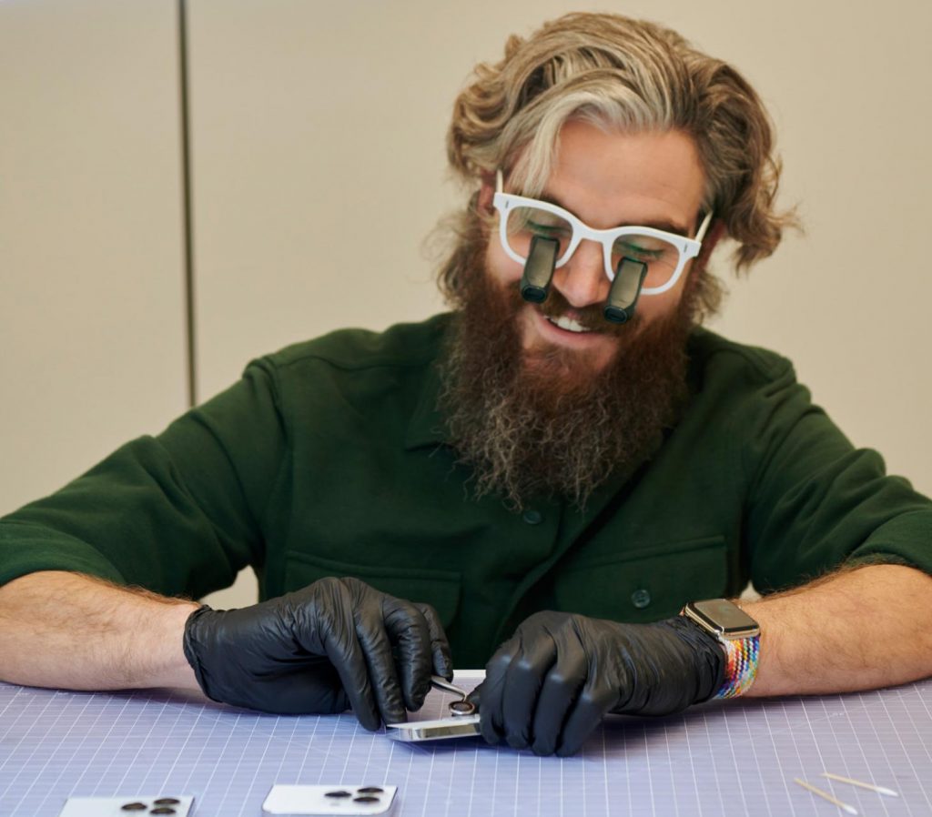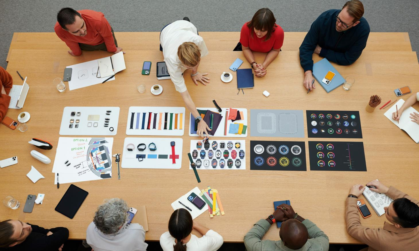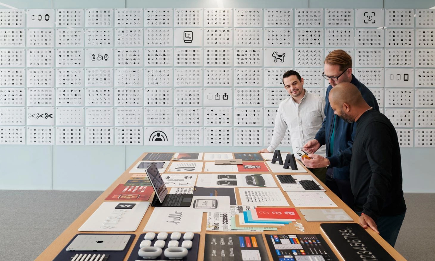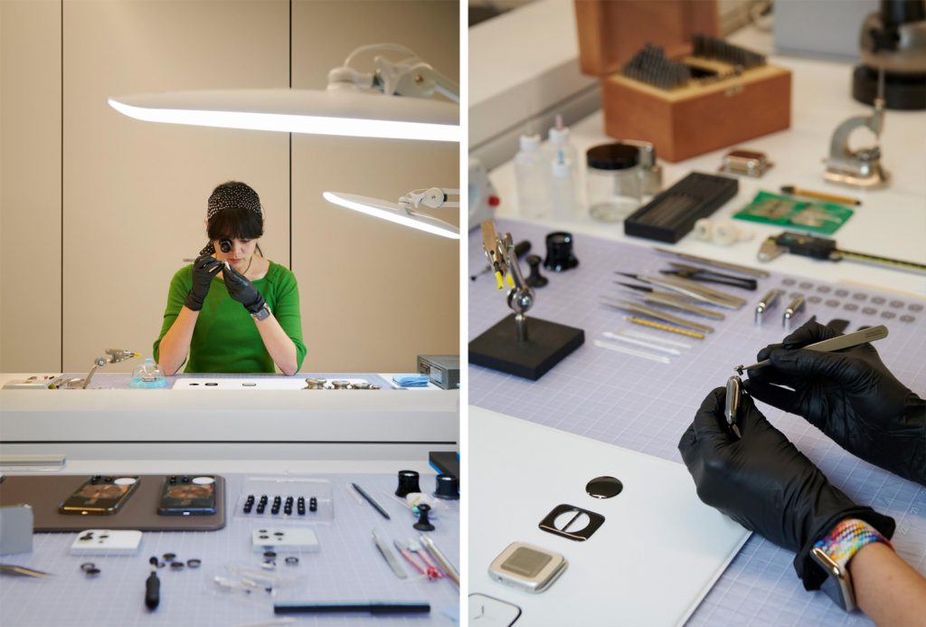Trong ảnh là góc nhìn từ tầng 4, hướng ra phía ngoài của Apple Park với hành lang tràn ngập ánh sáng và một công viên rộng lớn trồng 9.000 cây xanh Apple lần đầu tiên cho phép tạp chí Wallpaper vào bên trong và mô tả những gì diễn ra tại phòng thiết kế Design Studio, cho thấy quá trình làm nên những sản phẩm mới nhất của họ như iPhone, MacBook, Apple Watch… Chiếc bàn trung tâm là nơi đội ngũ thiết kế ngồi với nhau để thảo luận về hàng loạt sản phẩm đang trong quá trình phát triển Chuyên gia này đang lắp ráp các module camera vào mô hình iPhone 13 Pro Hàng loạt mô hình khác nhau được hãng tạo ra để nghiên cứu tỉ mỉ từng chi tiết thiết kế sản phẩm Một nhà thiết kế đeo kính lúp và lắp các linh kiện siêu nhỏ, như núm xoay Digital Crown, trên mẫu Apple Watch Series 7 Trong lúc này, một nhóm chuyên gia thảo luận về SF Symbols – tập hợp hơn 3.100 biểu tượng dùng trong các ứng dụng Máy gia công với độ chính xác cao đang khoan những cổng giao tiếp trên vỏ nhôm nguyên khối của máy tính MacBook Pro Nguyên mẫu của iPhone 13 Pro đang được mổ xẻ bên trong phòng thiết kế Các thành viên trao đổi về dòng sản phẩm mới, trên bàn là các mẫu iMac Một nhà thiết kế âm thanh đang tạo âm thanh tùy chỉnh trong phòng thí nghiệm của Design Studio Hàng loạt ý tưởng thiết kế được đề xuất trong những cuộc họp xung quanh chiếc bàn trung tâm. Cùng lúc, họ có thể bàn về màu sắc của iMac mới, hay thiết kế thân, dây đeo và mặt đồng hồ của Apple Watch