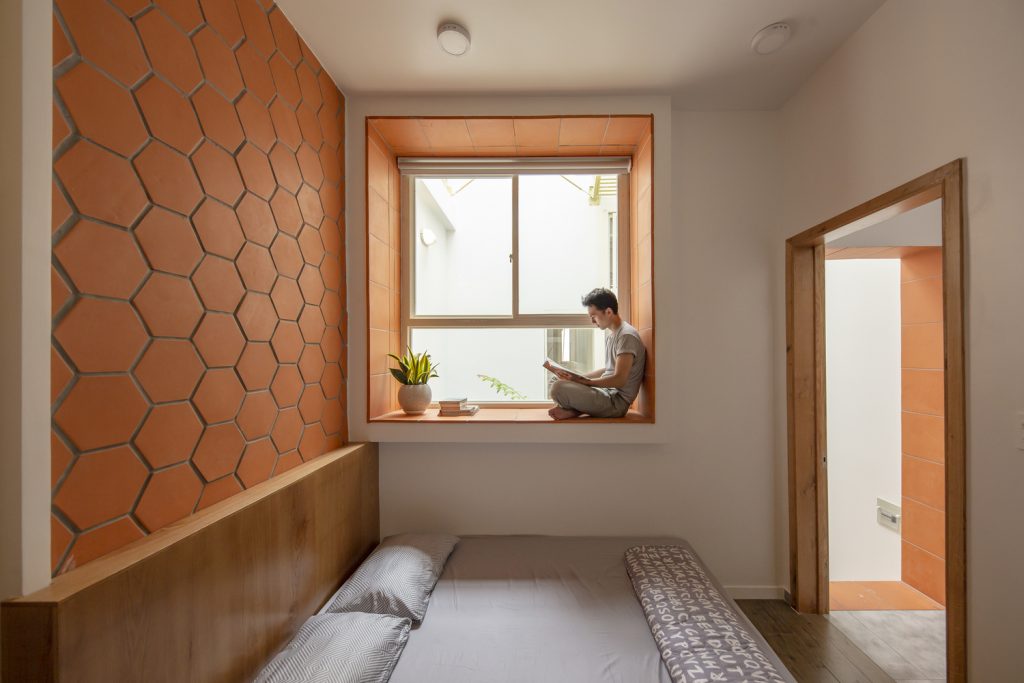 Cấu trúc phòng sinh hoạt học tập và ngủ của con trai được bố trí lệch tầng, tạo cảm giác thú vị cho người sử dụng. Đây cũng là không gian điểm nhấn với những ô ban công lệch tầng mở ra mặt tiền và nhìn xuống phần sân vườn phía trước nhà.