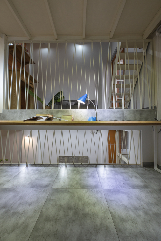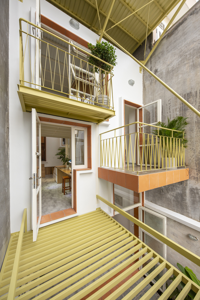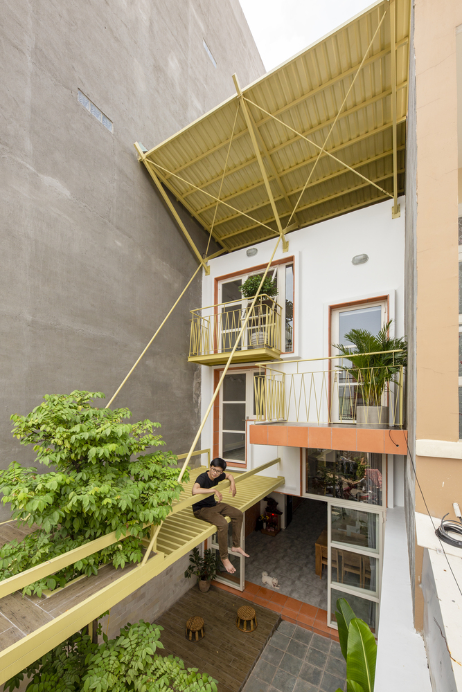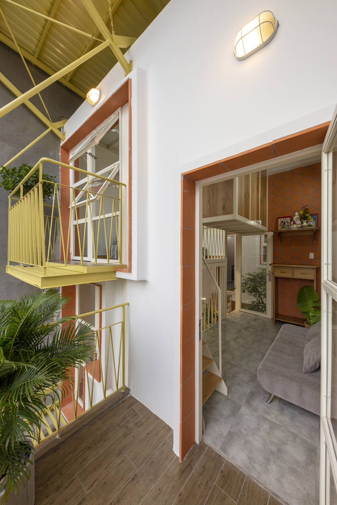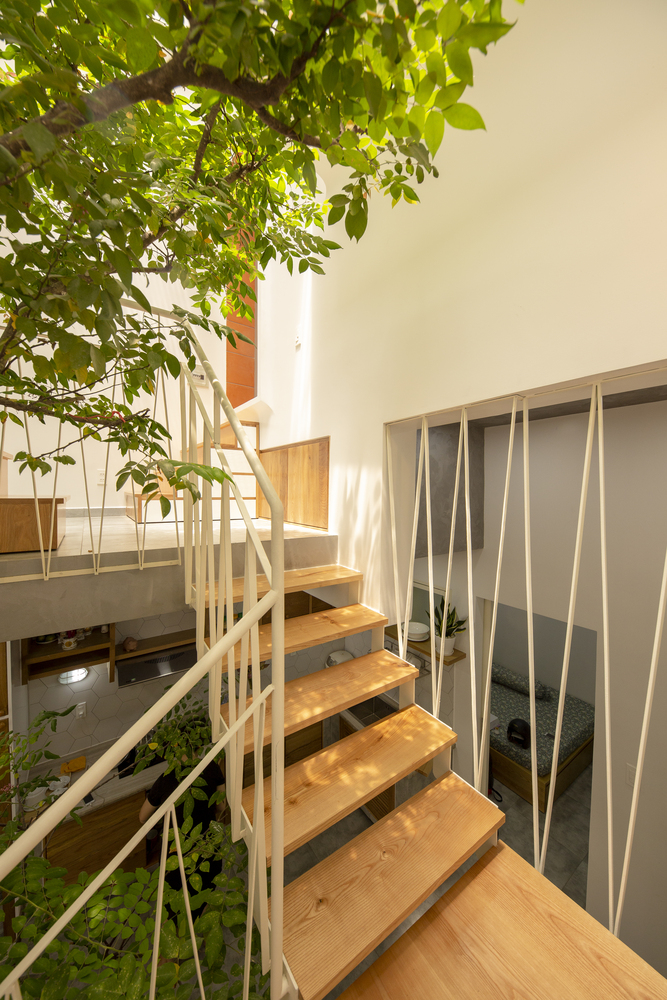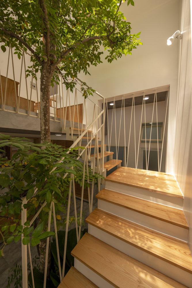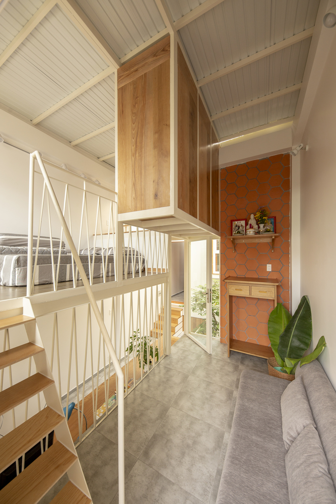 Cấu trúc phòng sinh hoạt học tập và ngủ của con trai được bố trí lệch tầng, tạo cảm giác thú vị cho người sử dụng. Đây cũng là không gian điểm nhấn với những ô ban công lệch tầng mở ra mặt tiền và nhìn xuống phần sân vườn phía trước nhà.
