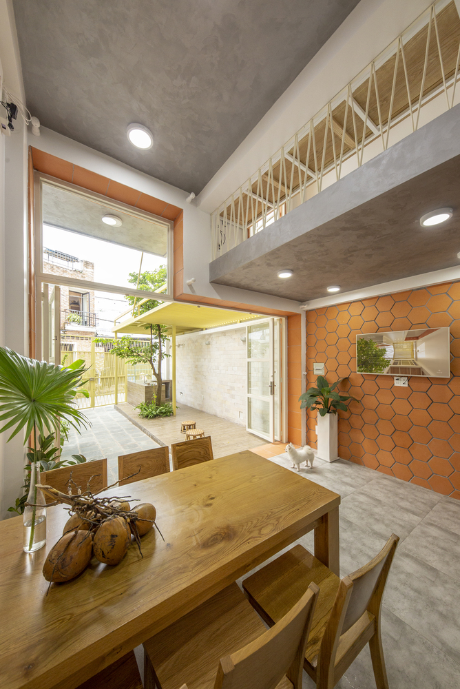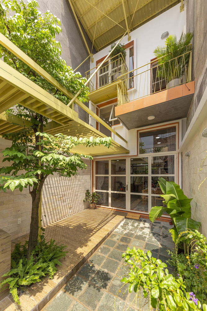 Nhà hai mái tôn được bắt tay thiết kế trên khu đất khá dài, xấp xỉ 4m x 17m, chủ nhà muốn chừa ra phần sân khoảng 5m để làm công năng buôn bán có quầy pha chế nhỏ và phần khu ở của gia đình đẩy thụt lùi về phía sau.