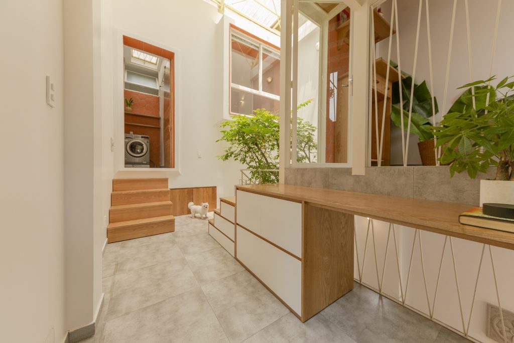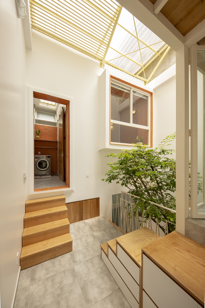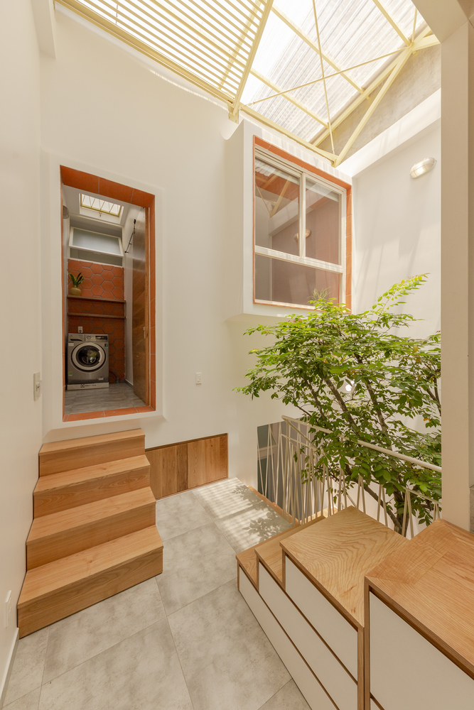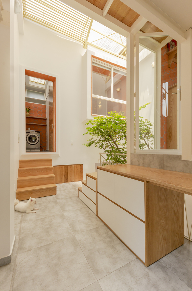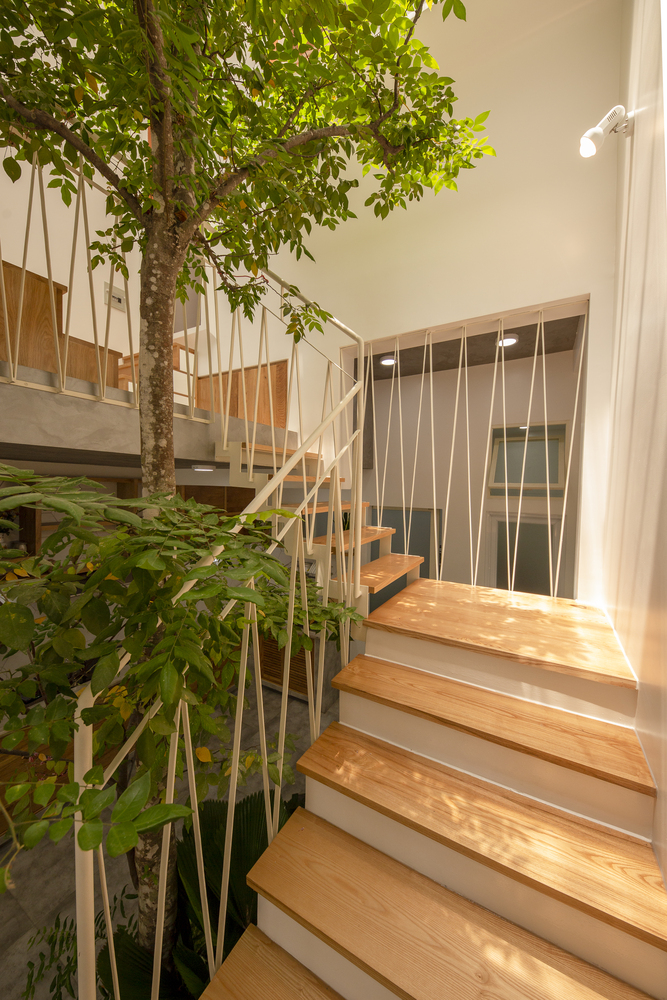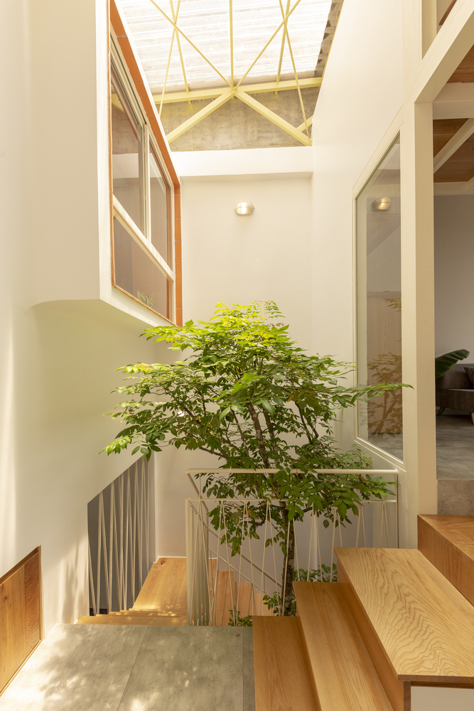 Nhà chỉ có ba thành viên nên nhu cầu xây cất cũng không quá nhiều. Chủ nhà ưu tiên thông thoáng tự nhiên và không dùng máy lạnh nên đây là một cơ hội quý báu để Khuôn Studio suy nghĩ về một hệ mái thông gió cách nhiệt tốt lại nhẹ nhàng như hệ mái tôn hai lớp.
