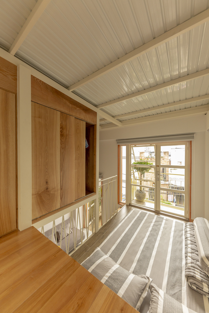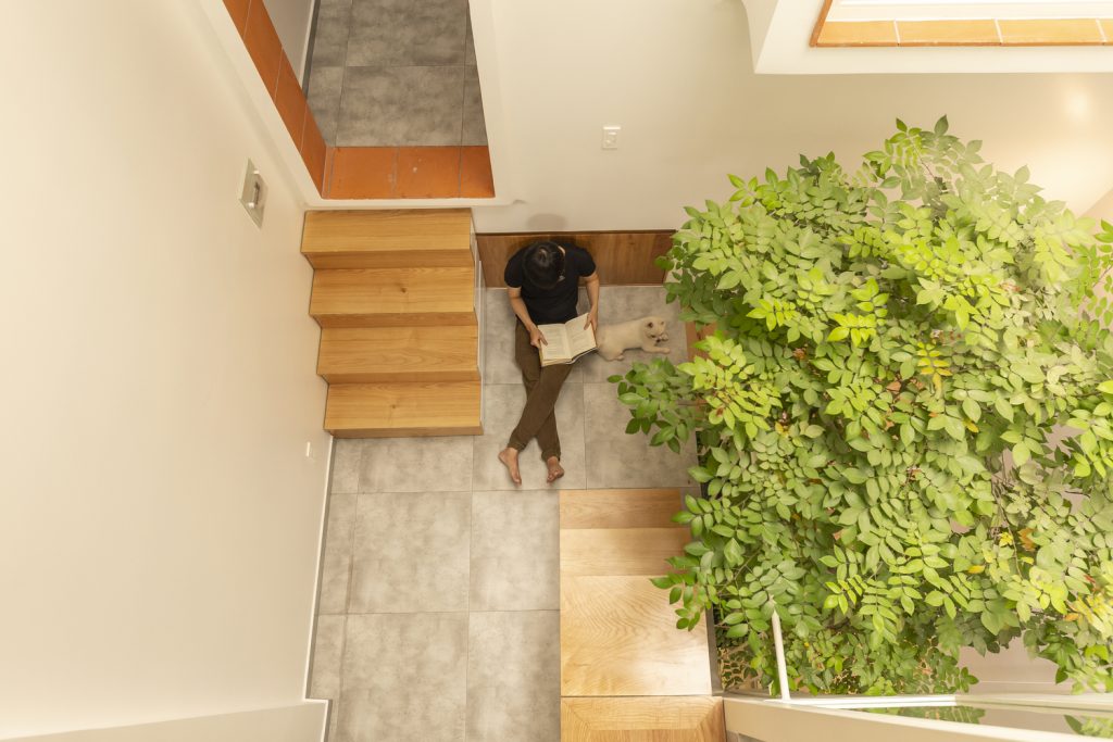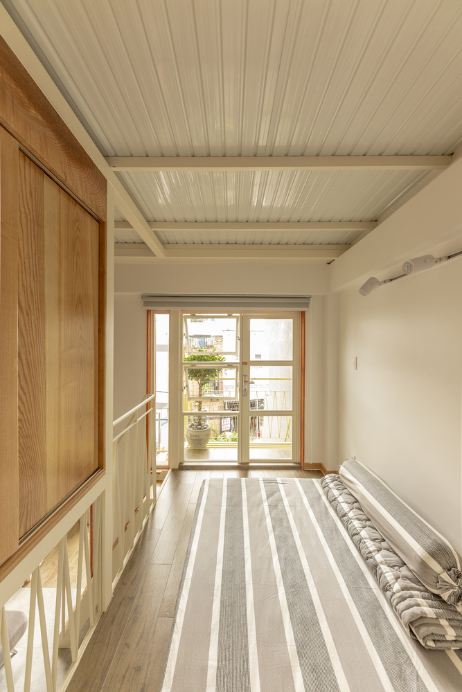 Lầu 1 là không gian riêng tư của gia đình, giếng trời như một lõi xanh, tạo cảm giác thư thái khi nghỉ ngơi trên lầu. Phòng ngủ bố mẹ nơi được bố trí một ô cửa sổ lớn để ngồi đọc sách thư giãn nhìn ra giếng trời, từ ô cửa sổ này có thể quan sát được khu sinh hoạt hoạc tập của cậu con trai nhỏ.