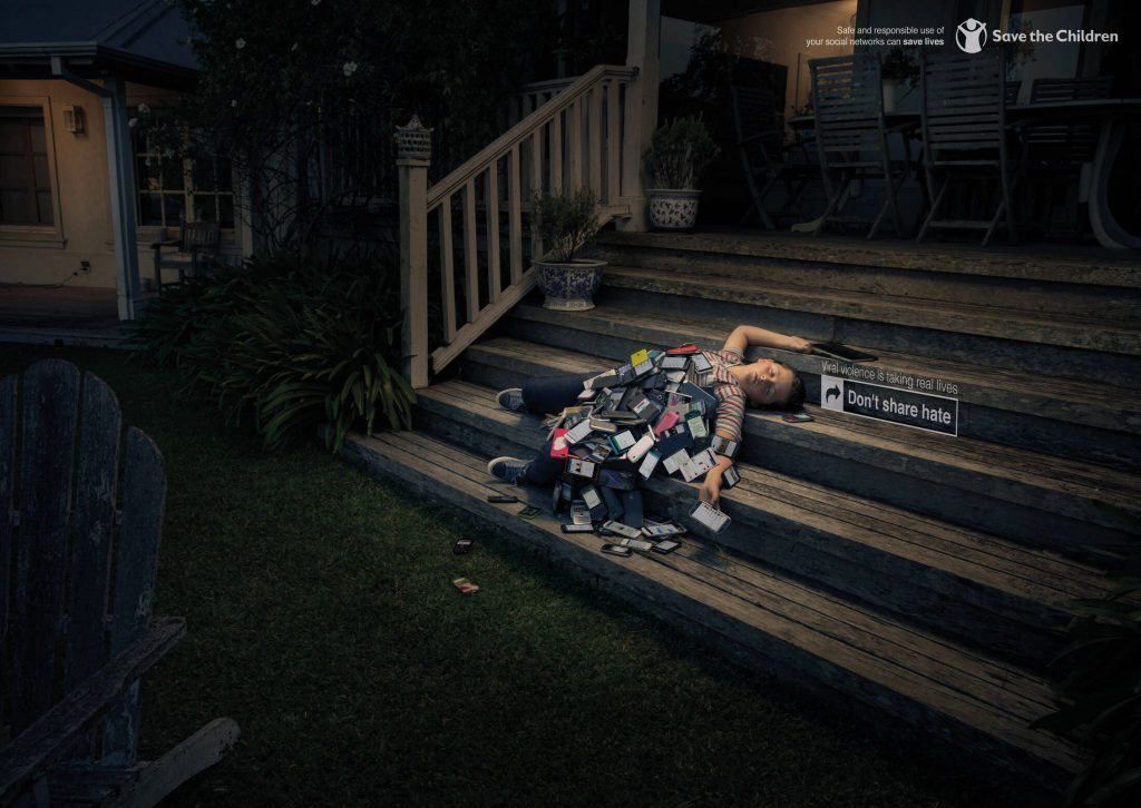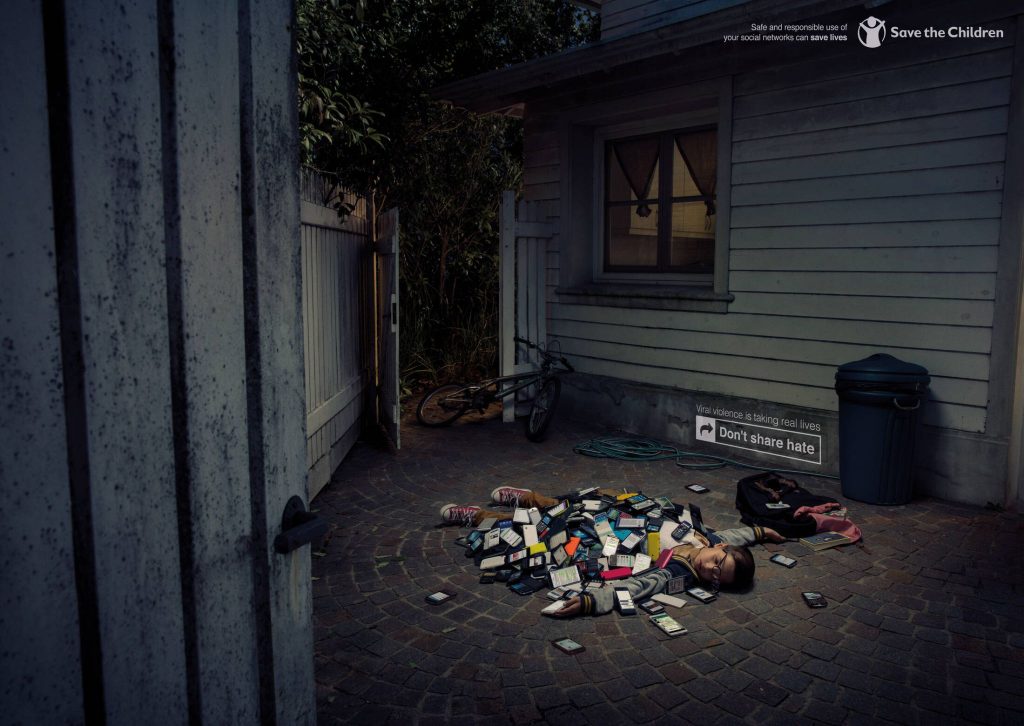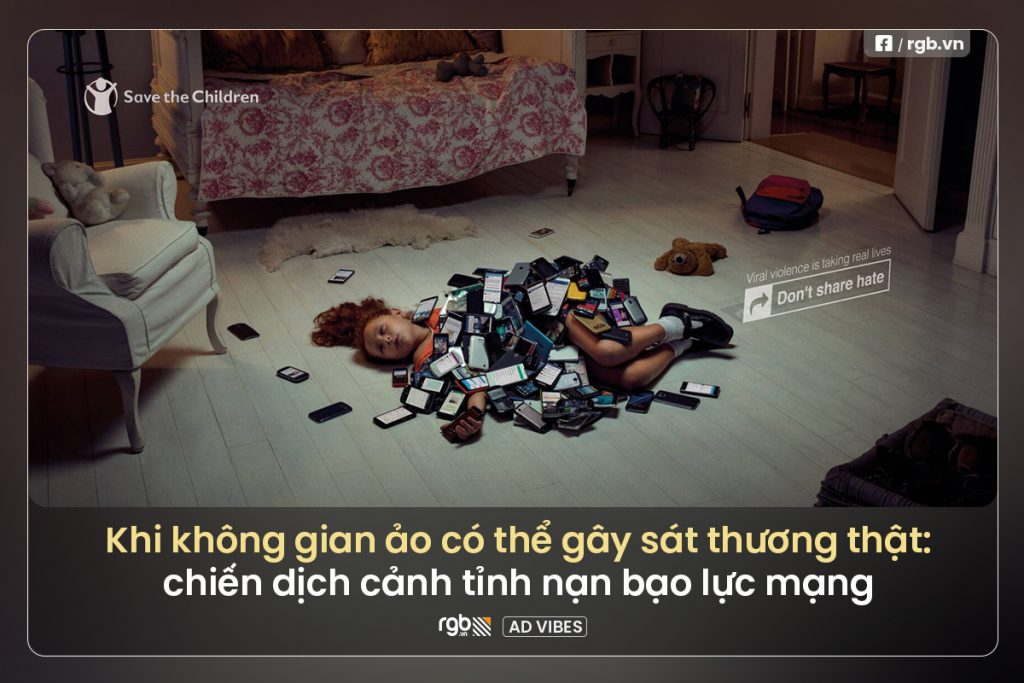 Chiến dịch mang tên “Don’t Share Hate” (tạm dịch: Đừng chia sẻ sự thù ghét) mang đến những hình ảnh ám ảnh đến nghẹt thở. Những nạn nhân vô hình của bắt nạt mạng bị phủ kín bởi điện thoại và tin nhắn độc hại mang đến một thông điệp mạnh mẽ: bạo lực mạng không ảo, nó gây “sát thương” thật.