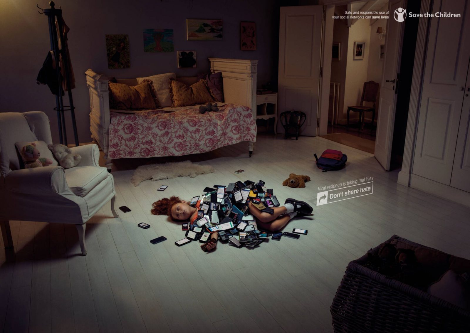 Chiến dịch mang tên “Don’t Share Hate” (tạm dịch: Đừng chia sẻ sự thù ghét) mang đến những hình ảnh ám ảnh đến nghẹt thở. Những nạn nhân vô hình của bắt nạt mạng bị phủ kín bởi điện thoại và tin nhắn độc hại mang đến một thông điệp mạnh mẽ: bạo lực mạng không ảo, nó gây “sát thương” thật.