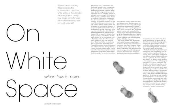 “Less is more” là một nguyên tắc cơ bản để phát huy sức mạnh của không gian trắng. Bằng cách thêm vào hoặc bớt đi những khoảng trống xung quanh các yếu tố mà bạn muốn gây sự chú ý hoặc làm nổi bật tầm quan trọng của họ, và thậm chí chảy ra tâm trạng nhất định, chẳng hạn như thanh lịch.