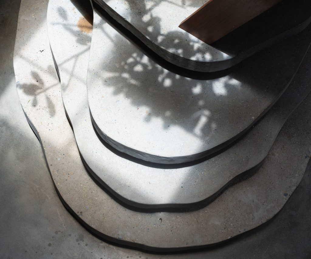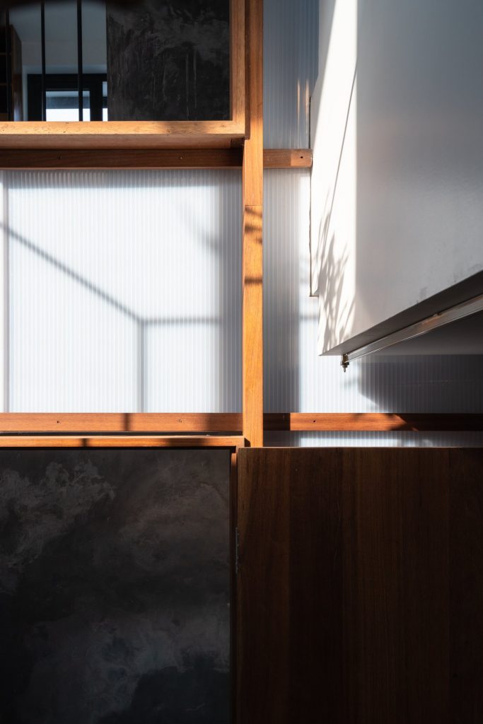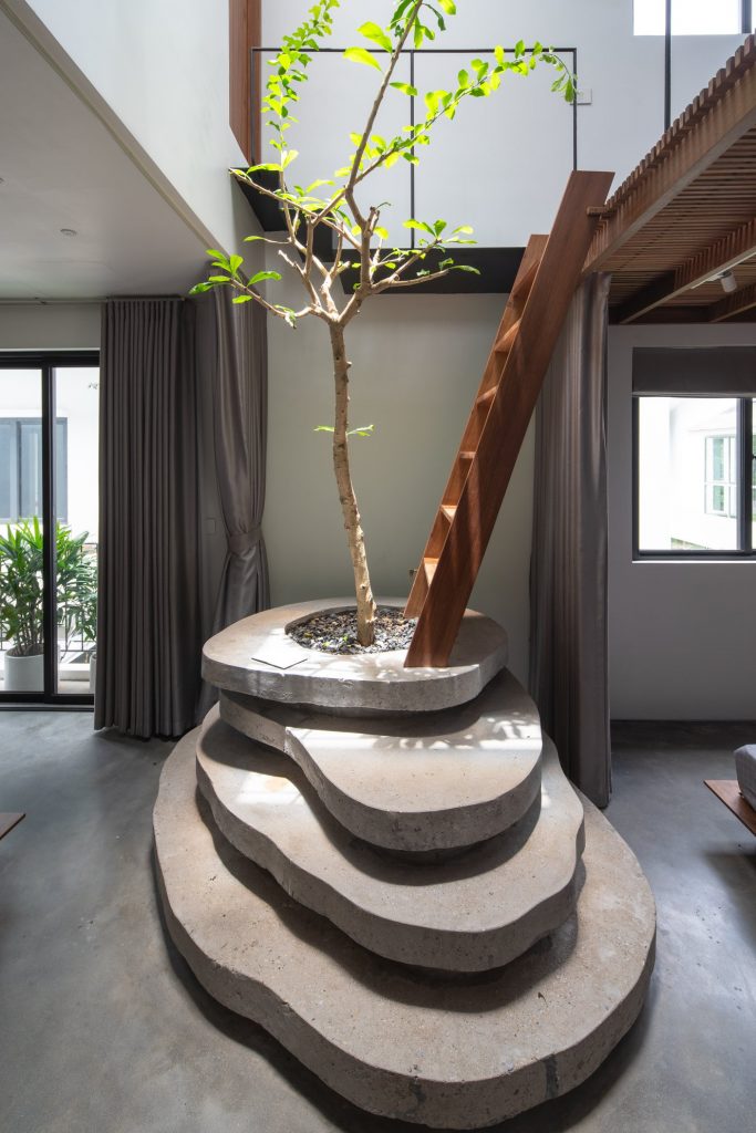 Toàn bộ sàn bê tông hiện có của khu vực này được phá bỏ, thả vào trong khoảng trống đó khối nhà nhỏ 1 trệt, 1 lửng với khung kết cấu gỗ, bao phủ vật liệu trong mờ (polycarbonate 20mm 50% xuyên sáng). Đó là không gian ngủ, học, chơi, thư viện, vệ sinh của 2 đứa trẻ. Các chức năng này được phát triển xoay quanh 1 chậu cây nhỏ được tạo bởi 4 thớt bê tông không định hình – hay có ai đó nói rằng trông như những thửa ruộng bậc thang.