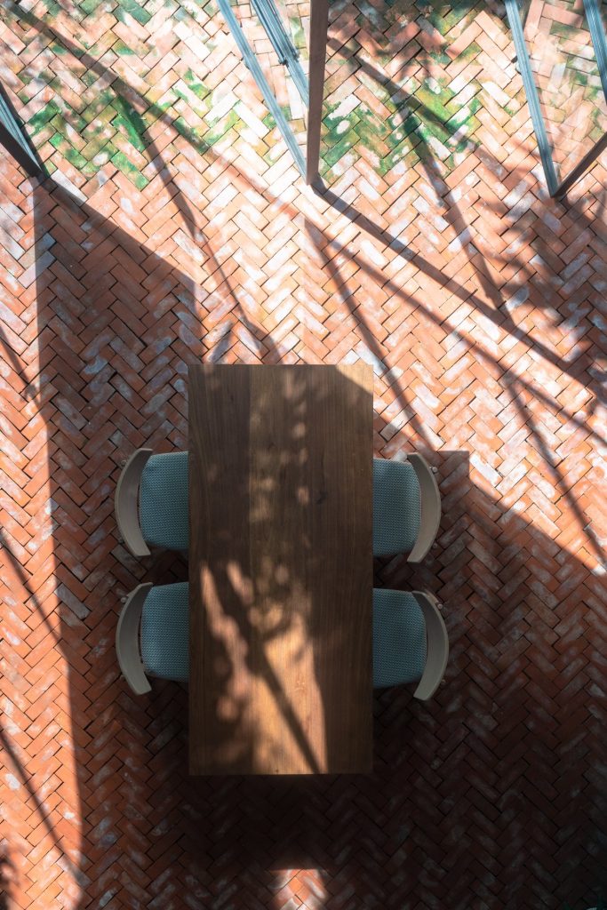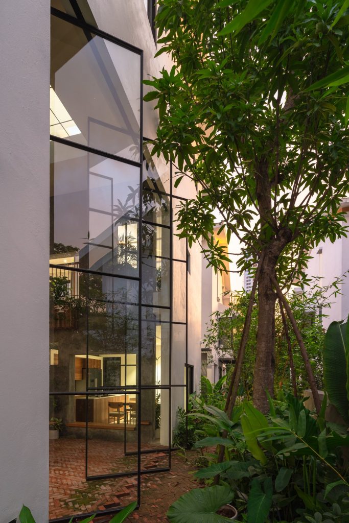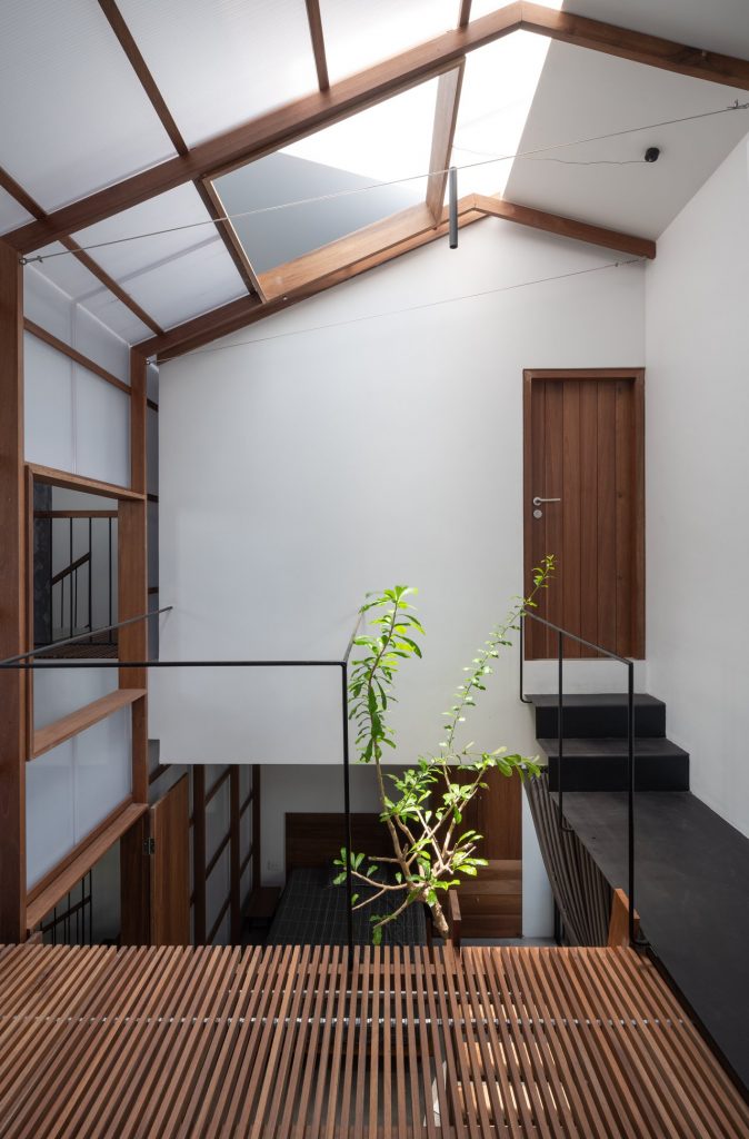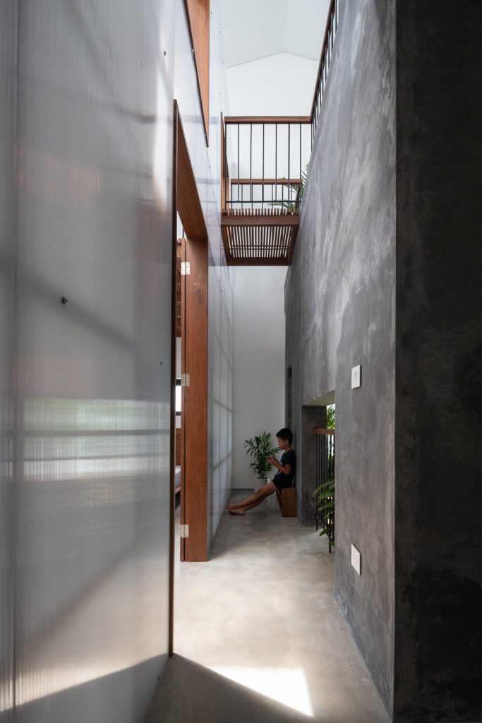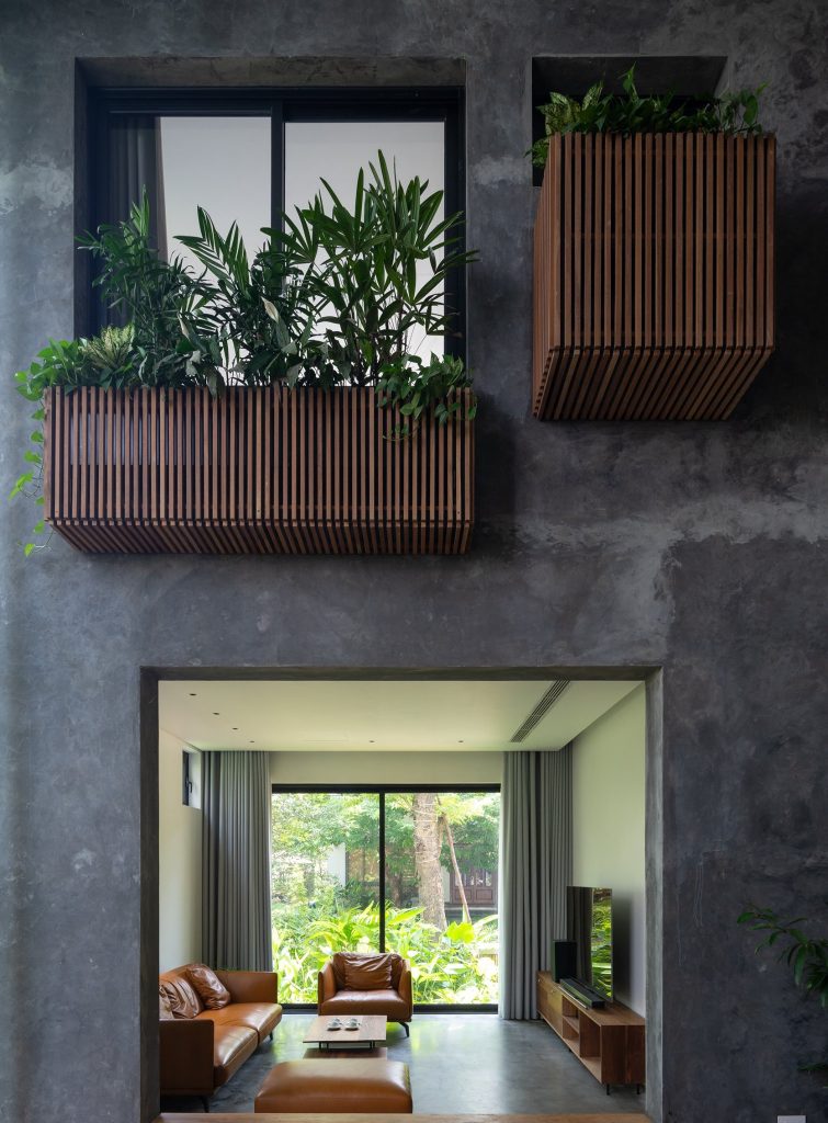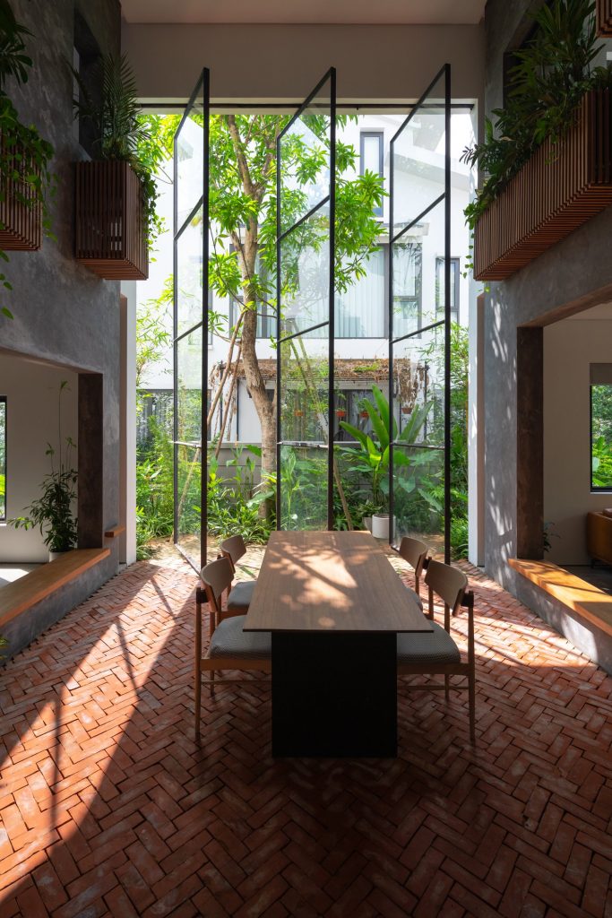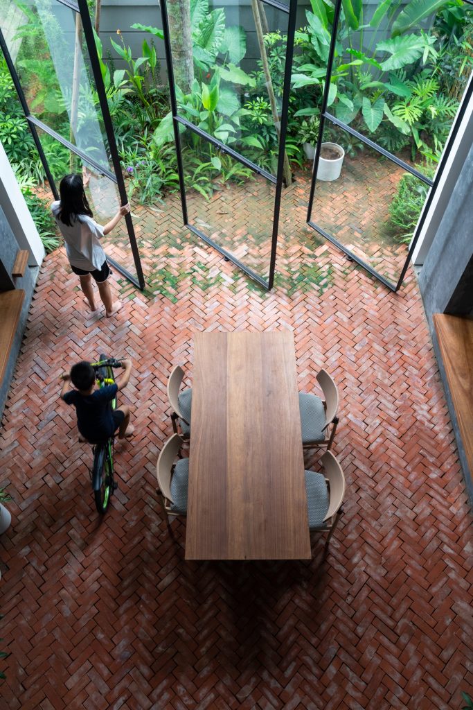 Không cửa sổ ngăn cách giữa trong phòng và khu vực ăn; hệ vách xoay linh hoạt, trong suốt giúp tạo ra một không gian sinh hoạt chung nửa trong nhà, nửa ngoài trời. Không gian này phát triển theo trục đứng bởi hai khối chức năng rõ ràng: khối phòng ngủ master và khối nhà-trẻ-con thú vị. Các chậu cây treo trên các diện tường xi măng là yếu tố kết nối mềm giữa các trục không gian. Trong khi khối ngủ của bố mẹ là một không gian tiêu chuẩn thì khối nhà-trẻ-con chứa đựng đầy đủ sự thú vị, tìm tòi, khám phá, vận động cho con trẻ.