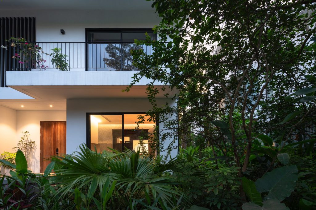Cảnh quan sân vườn không trồng cây lớn đắt tiền, thay vào đó là các chủng loại cây nhiệt đới dễ sống, chi phí thấp, phát triển tự nhiên quanh lối đi dạo bằng gạch nung xếp thủ công…để toàn bộ công trình không nổi bật mà ẩn sau nhiều lớp cây xanh tươi mát một cách nhẹ nhàng.