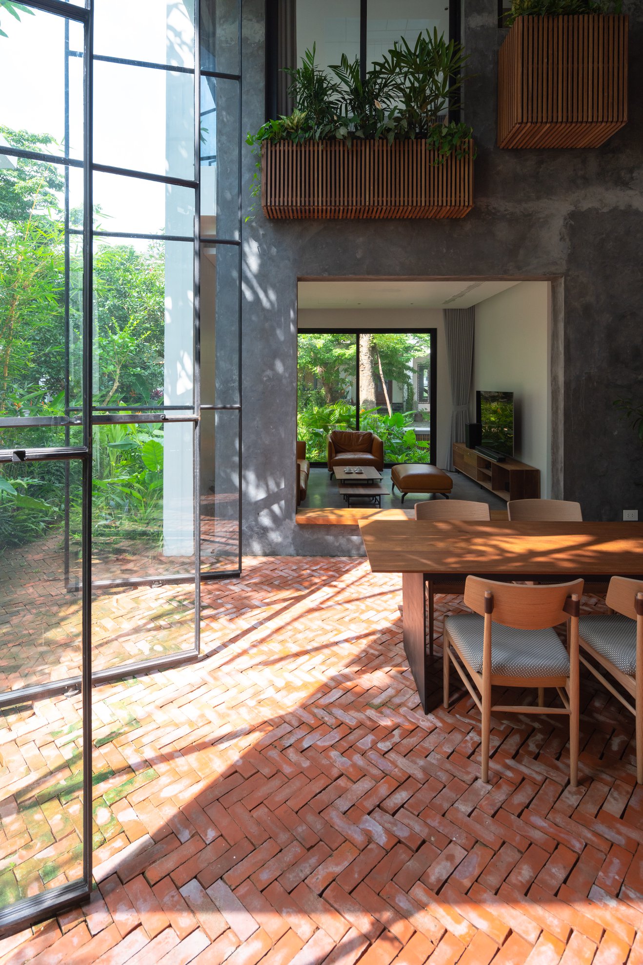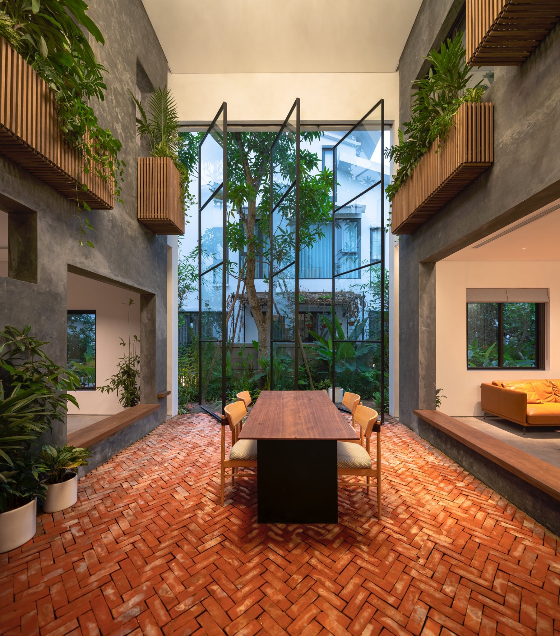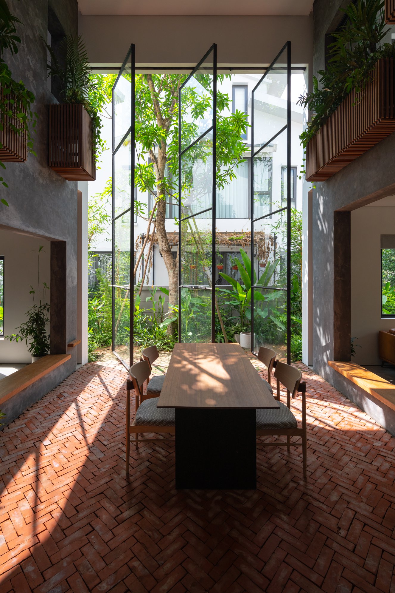 Không cửa sổ ngăn cách giữa trong phòng và khu vực ăn; hệ vách xoay linh hoạt, trong suốt giúp tạo ra một không gian sinh hoạt chung nửa trong nhà, nửa ngoài trời. Không gian này phát triển theo trục đứng bởi hai khối chức năng rõ ràng: khối phòng ngủ master và khối nhà-trẻ-con thú vị. Các chậu cây treo trên các diện tường xi măng là yếu tố kết nối mềm giữa các trục không gian. Trong khi khối ngủ của bố mẹ là một không gian tiêu chuẩn thì khối nhà-trẻ-con chứa đựng đầy đủ sự thú vị, tìm tòi, khám phá, vận động cho con trẻ.